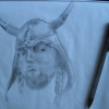 This is a pencil sketch of Dth 2 Goby. The portrait is a combination of two of his own portraits, plus a Viking helmet, because Mistress MeiMei liked the braids and the helmet goes with the braids. The paper is tracing paper, only because I had it on...