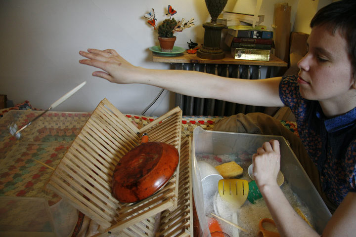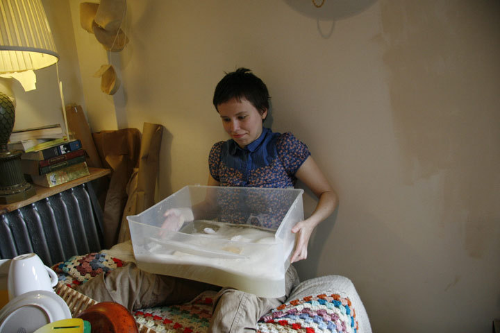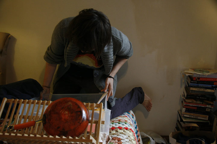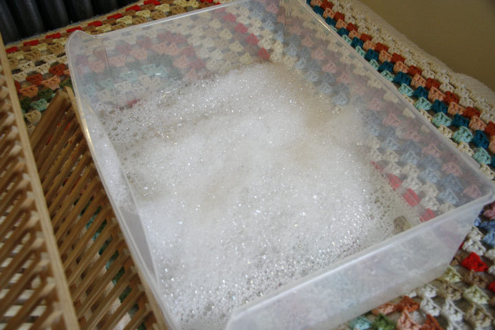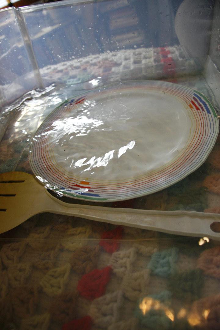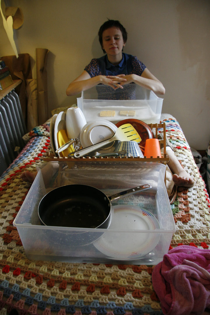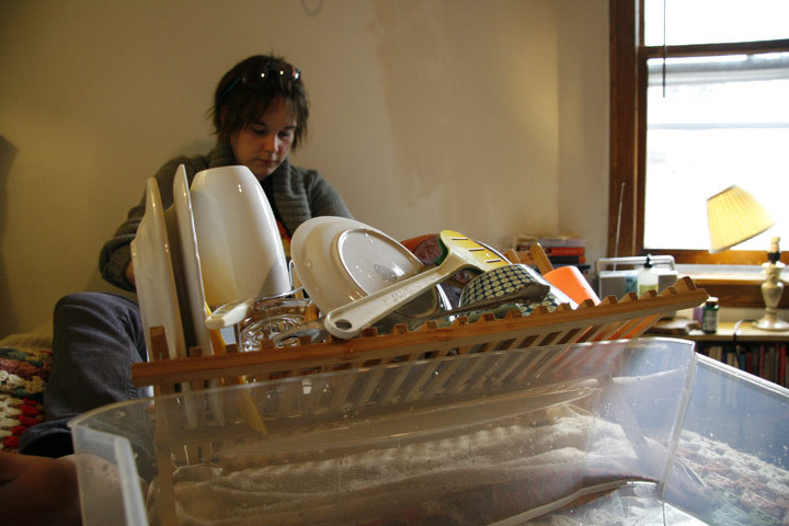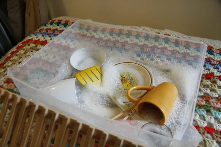 using old plastic drawers for the basins, we filled them with water (one sudsy, the other fresh) and placed them beside a drying rack on her bed. we then proceeded to...wash the dishes in bed!