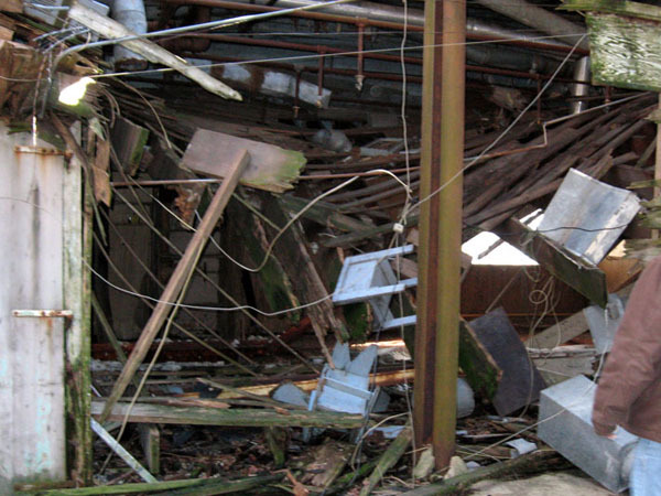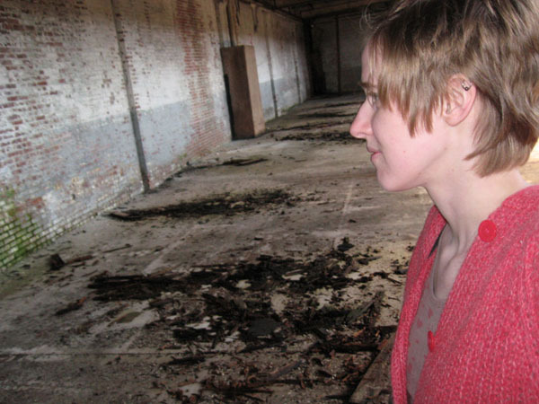 We found the mens' room. The ladies' room was buried under a collapsed portion of the roof, so we couldn't get in.