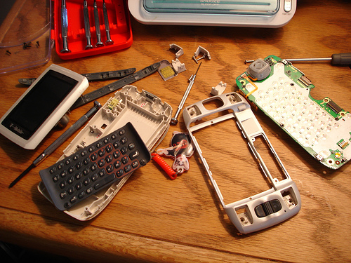 I deconstructed my hiptop2 (also known as a T-Mobile Sidekick II). Having some problems with the keyboard after it went on a trip with me down a river in a kayak and it probably got some minor water damage. I documented with photography and basic instruction how to deconstruct a hiptop2 on Flickr. I will attach a few photos on SF0 but here is the full documented deconstruction.