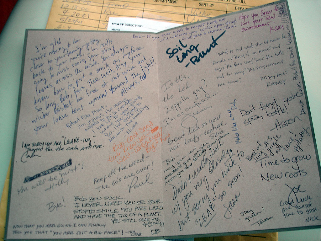 This was the biggest hit. People were writing hilarious notes such as "Robert Fake Plant- I'm jealous I've always wanted to live in Colorado. I look up to you - going where you want to go. I'm stuck in MN with the humidity. - Nicole" and "Bob- If you ever wish to re-pot here, we will welcome you with open gloves! Give peas a chance. Carol." Take time to look at the photos of his going away card. It truly shows how our company blindly embraced our employee forgery.