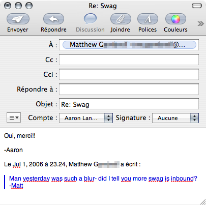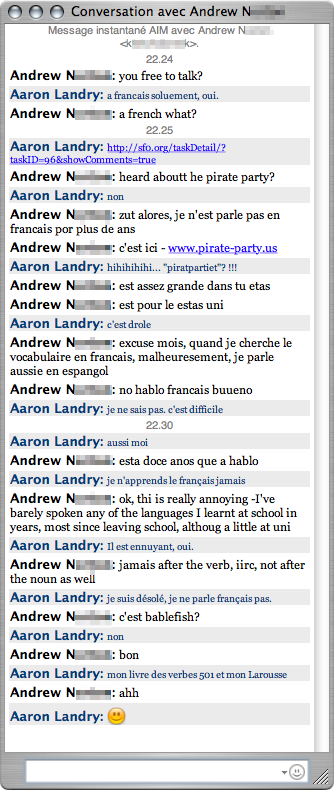 Met up with Bo. Per our previous text messages, he understood I couldn't speak English. He verified that with me verbally and he was cool with it. He thought it was funny and wasn't terribly surprised with it. During this, here's a few messages from my friend Bill I got: "You can stop now." "Is your task to fuckiong piss me off? Because it's working. 2100 pts for you." I hand my hiptop to Bo and he types to Bill: "Hey. This is bo. I can type in english" Bill signs off right as Bo was typing "Aaron must speak only french until 2100 tomorrow." As Bill didn't get that last line I took the hiptop back, copy/pasted the conversation into an email to him. He sends me an SMS with a single-word rude comment I won't repeat that essentially expressed how he thought how dumb it was. Maybe he was right.