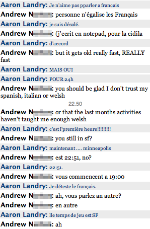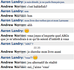 Roommate Matt and his girlfriend Amy are out and about getting trashed and they thought it'd be funny to send me instant messages in french. Amy knows basic French and Matt doesn't know any. I ignore most of the text messages... until I got this: