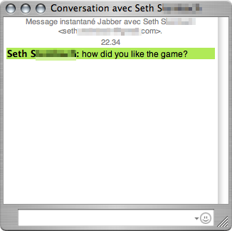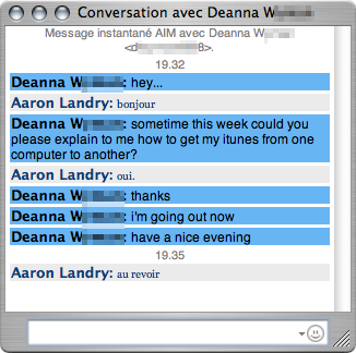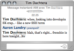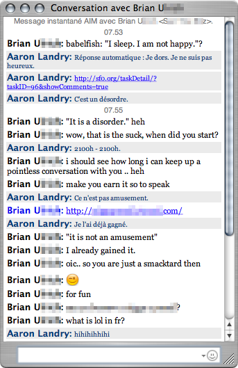 7h54 Seeing I'm not idle anymore on AIM, my friend Brian messages me trying to translate my away message: