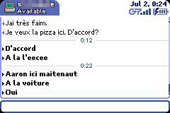 1h36 I get an instant message from Matt: "Where the hell are you?" and then I hand the hiptop to Amy. I try to instruct her to type on it, and she says, "read this?" I say, "non..." and gesture for her to type back. She says she doesn't want to tell him. I raised my voice and she finally typed "Ici est amy." I was getting so angry at this point because there was no reason why she needed to be typing in French. The whole reason I gave it to her in the first place was to type in English so Matt would know where we were. I raised my voice again "ANGLAIS!!!!!" She finally typed "In porch." then "Patio." Matt likely didn't know where that was so I took my hiptop back and left to go find him. Grr.