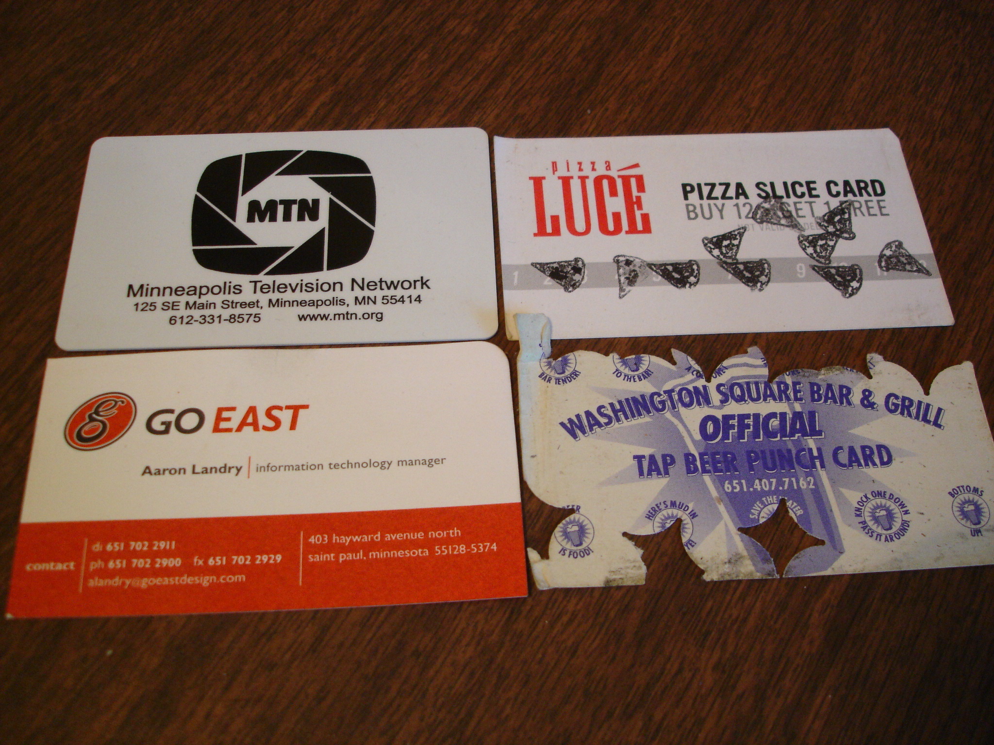 Concerning my changing items in my wallet, I've recently taken out the following: Post-It note containing a password to a co-worker's computer, business cards for Nicholas Kosevich, Tod Foley, Mike Obermueller and Brian Forrest. I'll soon be adding 4 tickets to "A Prairie Home Companion" showing at the Lagoon Theater on Thursday that are currently sitting on my desk. I will also possibly add a hotel points card for a hotel I'm staying at in Rochester, MN this upcoming weekend.