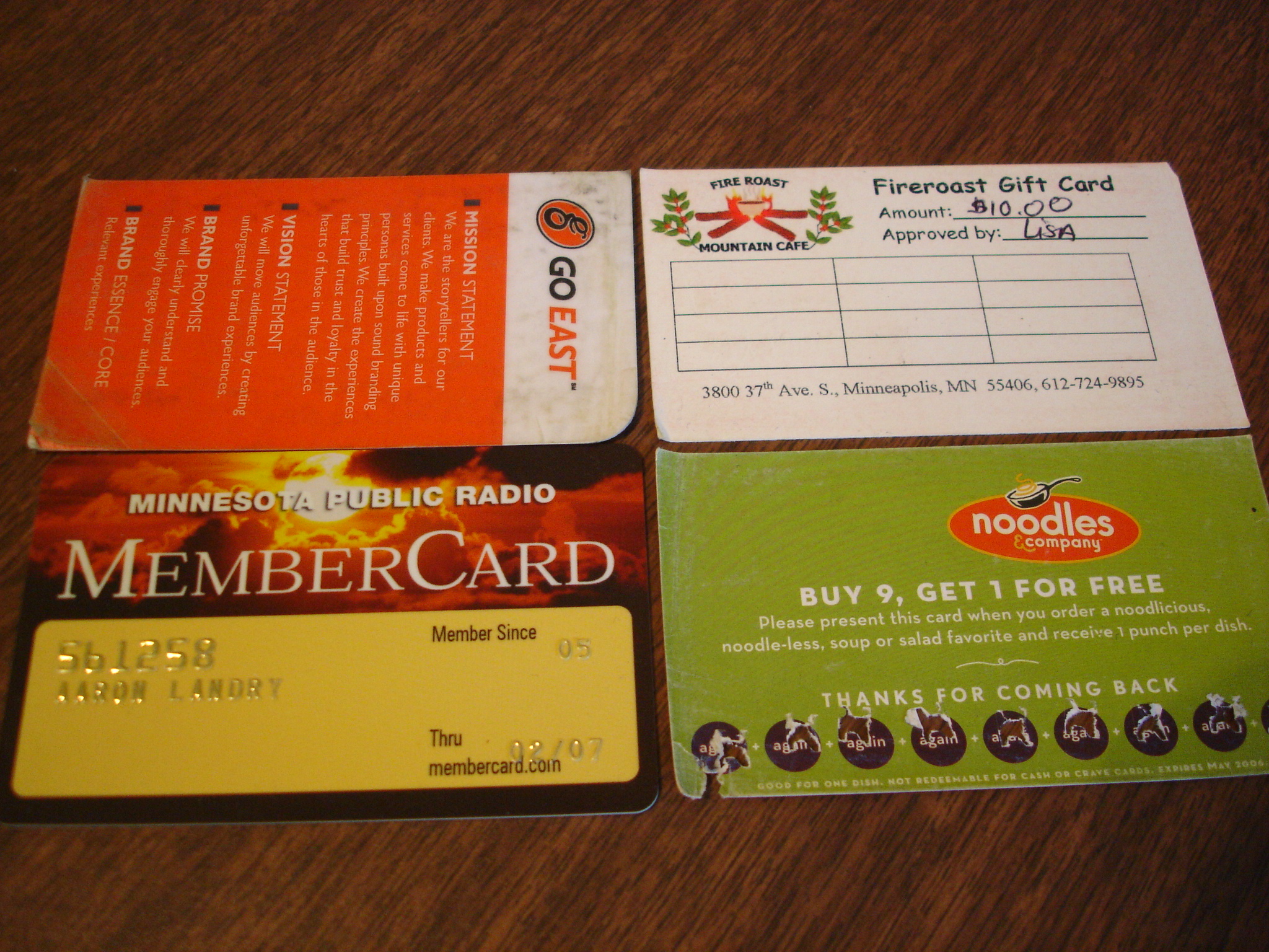 More about the company I work for (by way of reading a mission statement and such), I have a gift certificate for a local coffee shop (although in reality I rarely drink coffee), a card for free Noodles and now you know I'm an MPR member.