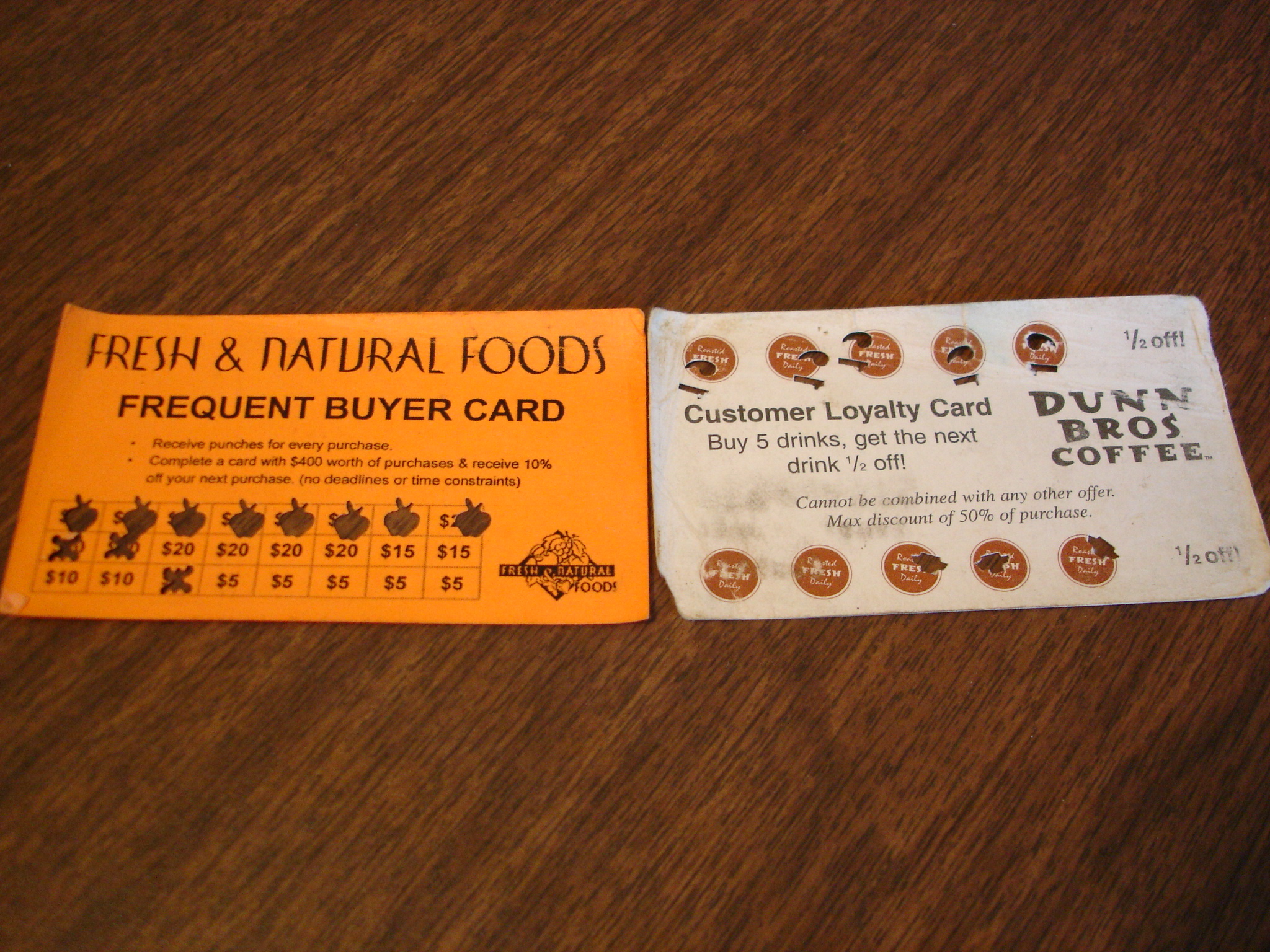 These two cards imply that I buy natural and organic foods (enough to decide to have a punch card) and yet another card that says I drink coffee. Honestly, I don't really drink much coffee at all!