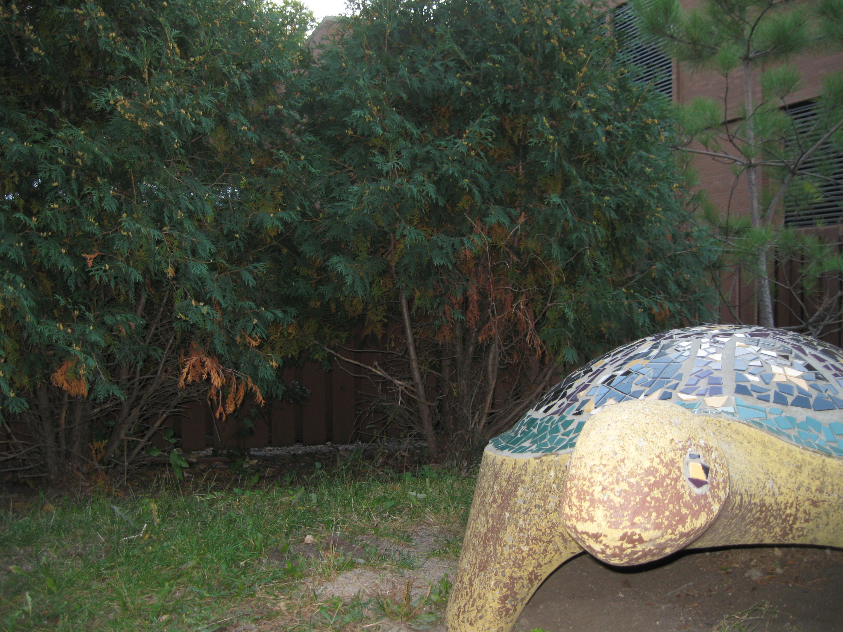 I knew I needed to look for bushes and a fence. And what do I see right behind the great turtle?