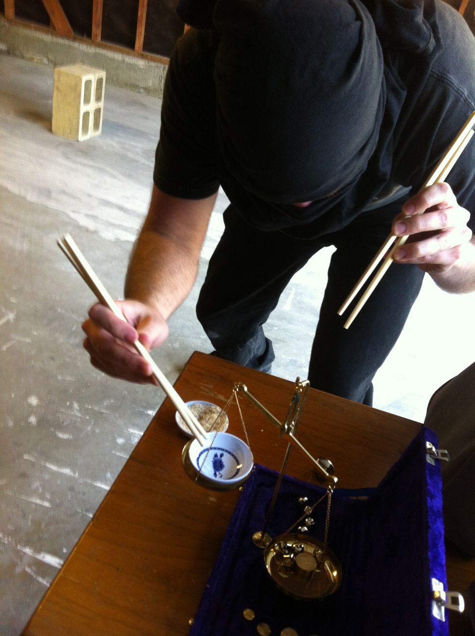 There were other tests as well. The Test of Patience was a sadistic little exercise meant to evoke the sort of hazing you see in martial arts films -- you had to use chopsticks to move grains of rice into a dish on a scale until it balanced. I'd dug through a lot of eBay listings to find an actual balance scale to use for this one, but hadn't yet done any testing to figure out how much rice was a reasonable amount. It turns out that it only takes a minute or two to move about 5 grams of uncooked rice using chopsticks, but it feels like much longer.