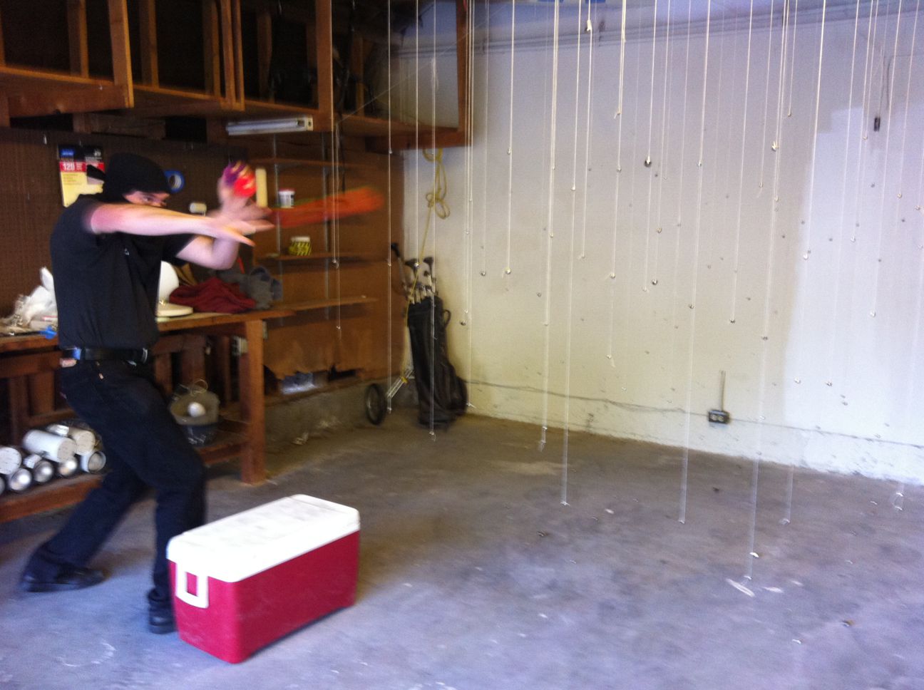 This went through a few rounds of playtesting as well to verify that it was fun to pelt each other with Koosh balls but that it was pretty difficult to actually cause any injuries. By the time I met up with Waldo, all was ready. We brought Lincoln by to check everything out. If I recall correctly, he even managed to make it through the Test of Stealth with the added "hard mode" challenge that Waldo had thought up...