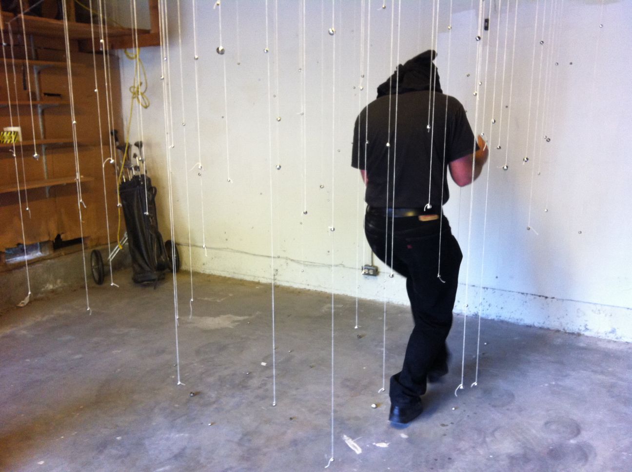It took longer to hang all the bells than I'd expected it would. With three people it ended up taking us about three hours in all, but the effect was kind of magical. As it neared completion we walked through it over and over, looking for places where it was too easy, adding more bells, retesting it... it got more and more challenging, and started to create that elusive "fun" thing that I had envisioned.