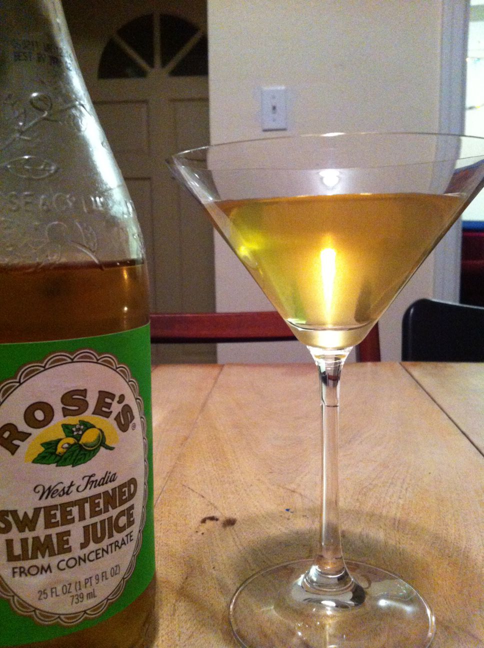 Obviously with that greenish color it wouldn't pass for unadulterated gin. To disguise it, I added Rose's lime juice, making it a perfectly respectable gin gimlet.