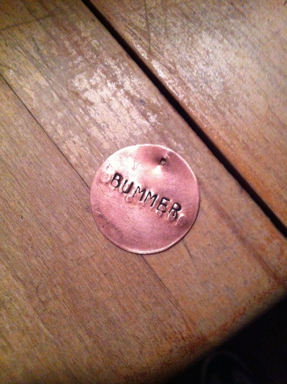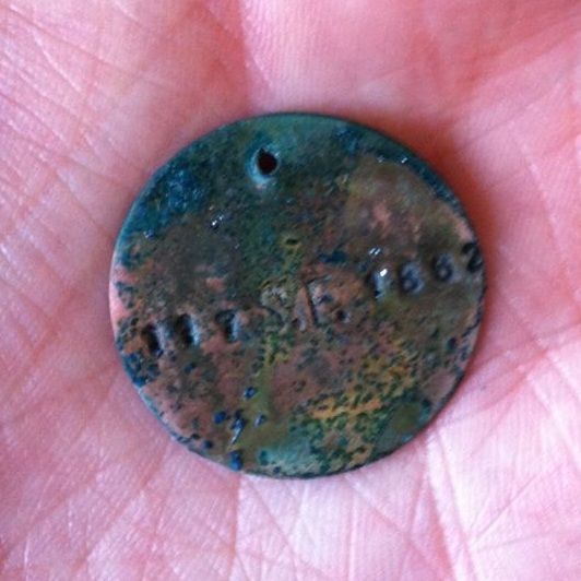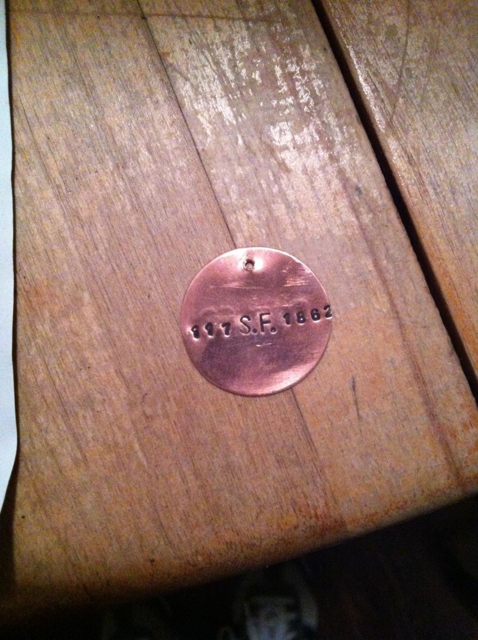 May 20th, 2012 3:47 PM / Location: 37.795160,-122.4022There's no historical evidence to suggest that Bummer ever had a tag, but in 1862 the Board of Supes declared him and his friend Lazarus exempt from city ordinances against stray dogs, so it's plausible that they might have received some sort of licenses and tags to make it official. Research into 19th-century dog tags suggested that hand-stamped copper disks wouldn't be too far off the mark, so I found someone on Etsy who does that type of work and secured a shiny new tag: