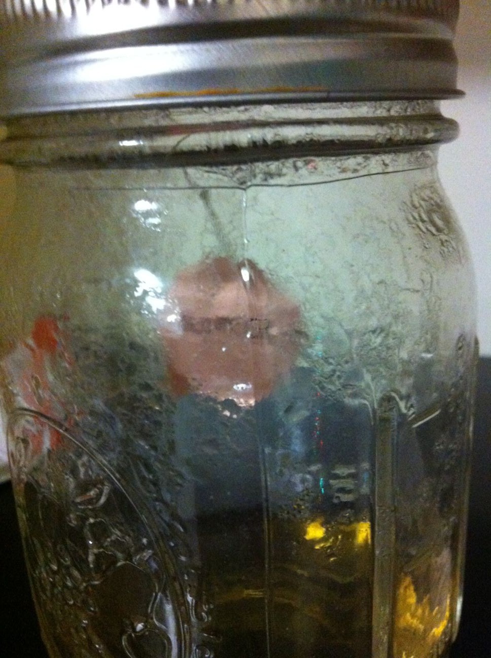 Resting it on a solid surface had a similar problem, where condensation would form on the surface and wipe the bottom side clean. After a lot more trial and error, I hit upon this method of suspending it horizontally over the vinegar steam bath: