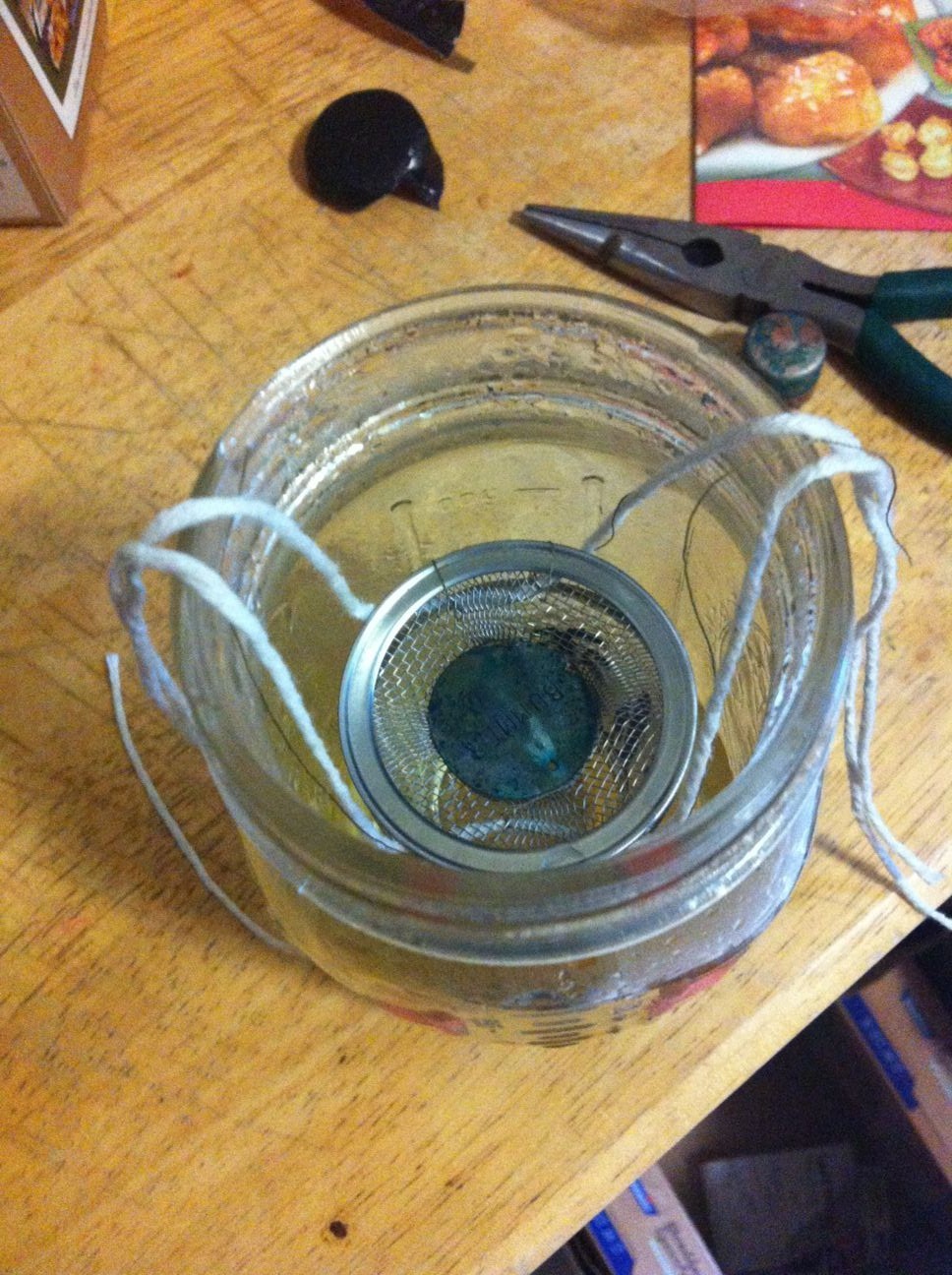 I had this task in mind when I did my earlier research into accelerating the aging process, and I took this opportunity to continue to refine my verdantification technique. To avoid the problem of inadvertantly cleaning the verdigris off, I suspended it inside a jar of steaming vinegar: