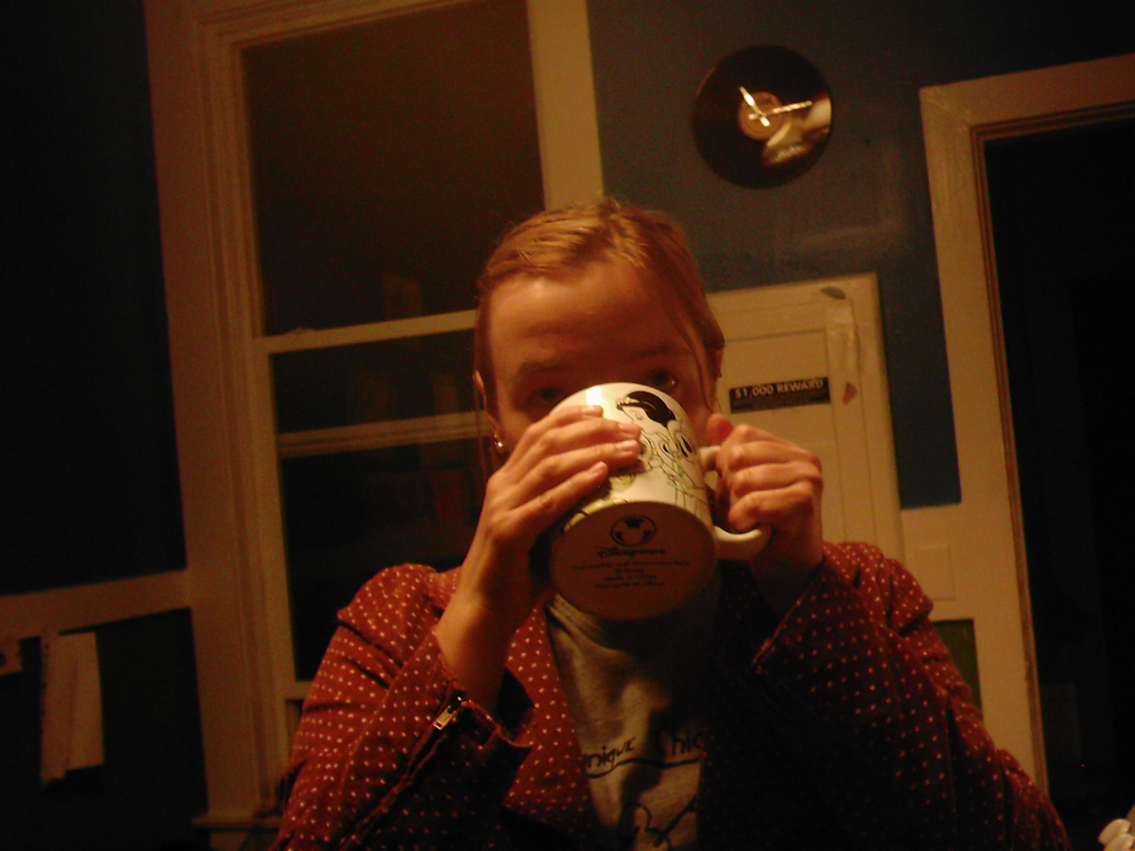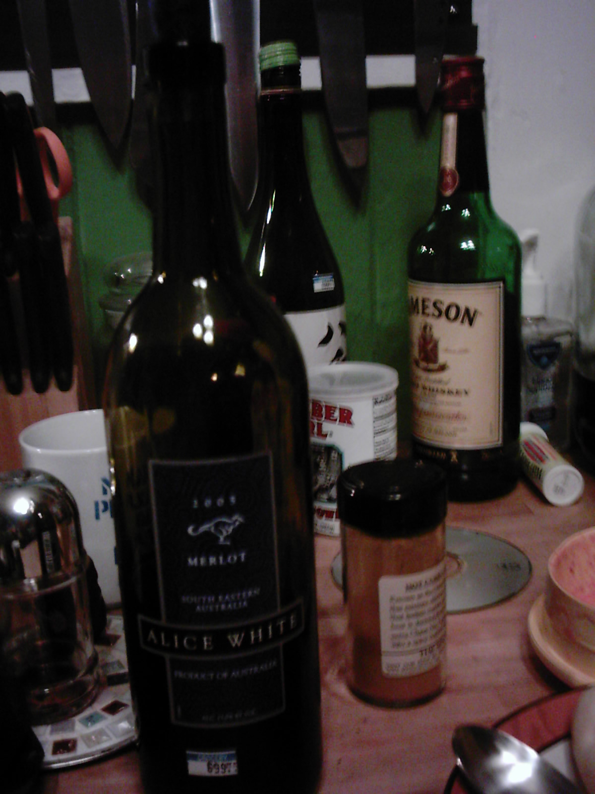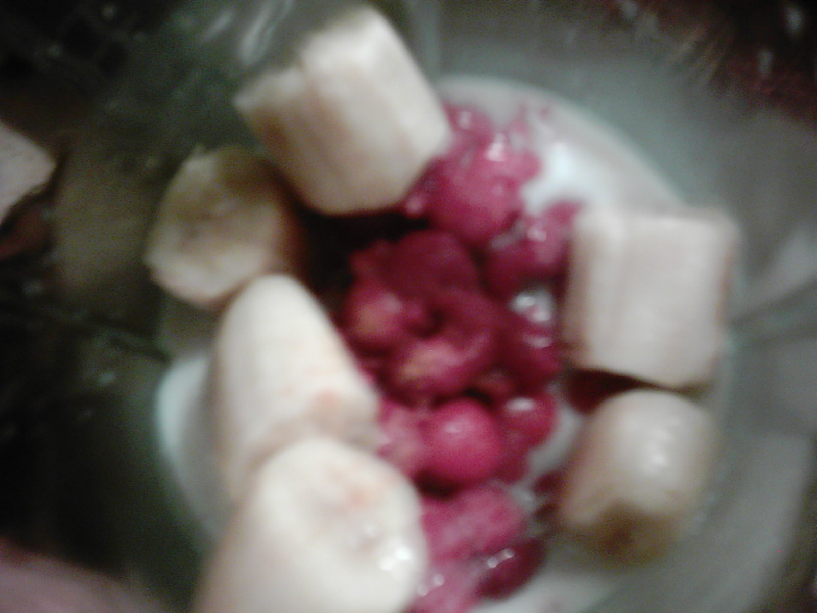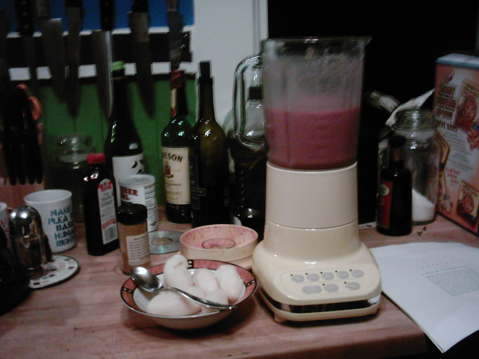 The basic recipe was frozen bananas and raspberries, soymilk, maple syrup, vanilla extract, and hot curry powder. The first taste was awful, way too much vanilla. To counteract the medicinal taste I poured in some sugar, but inadvertantly added a large lump. This tasted much better, but was now too sweet and slightly grainy. To sour it up, I added orange juice, and at Sam's suggestion added some red wine, because "Wine always makes things taste good." I added too much wine also, so to thicken it up I added ice cubes and, what the hell, new potatoes from a can. And more hot curry powder.