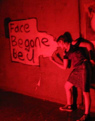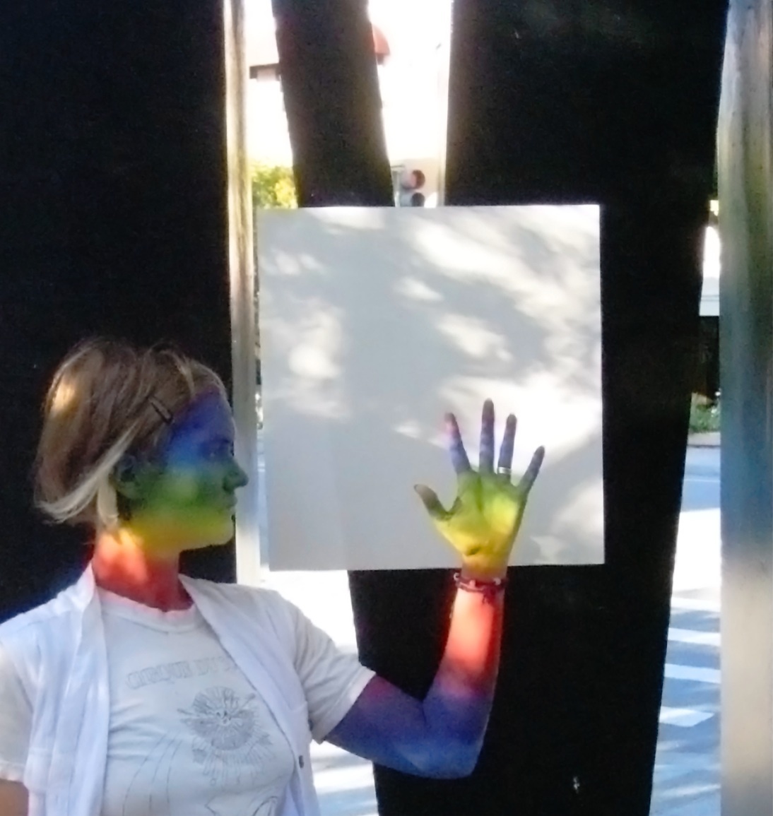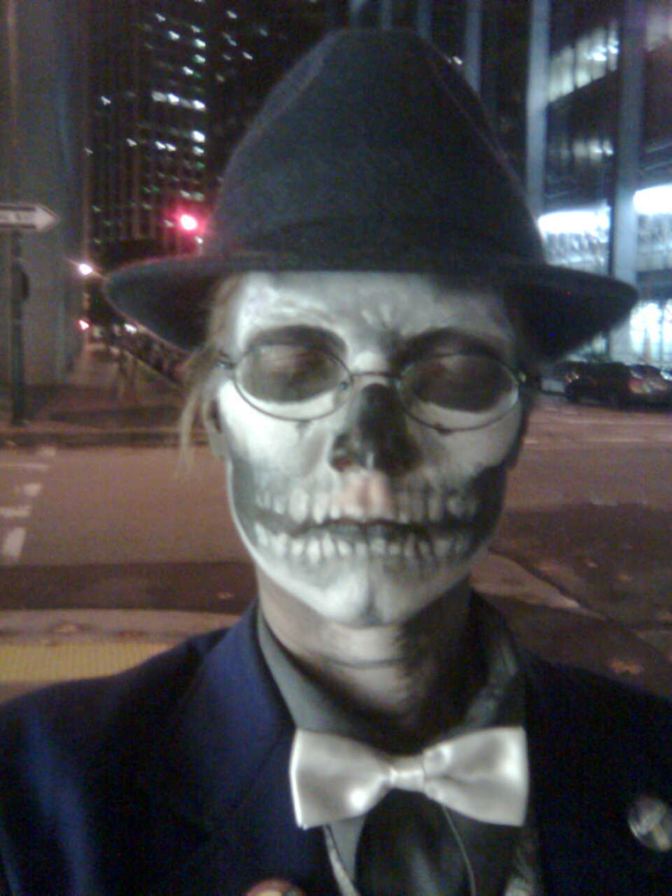 In downtown Santa Cruz. I wore the makeup for the rest of the day. some nice things happened, and here is the nicest: I was walking on the beach with my sister, and a guy ran up and said "you look hungry!" and offered us a toasted marshmallow on a stick. Now, this could have gone either way, he could have peed on it or something, but i decided that without trust there is no SF0 and i reached for the marshmallow. he pulled it back a little. i reached for it again. he pulled it back a little and said "you have to get it!" i asked "do you want me to grab it with my mouth?" and he said "no, you just have to get it!" so i just ran at him as fast as i could and he was startled and ran away and when he recovered he let me grab the marshmallow AND IT WAS PERFECT. if that's what pee does to marshmallows, i am going to pee on all my marshmallows from now on and so should you.