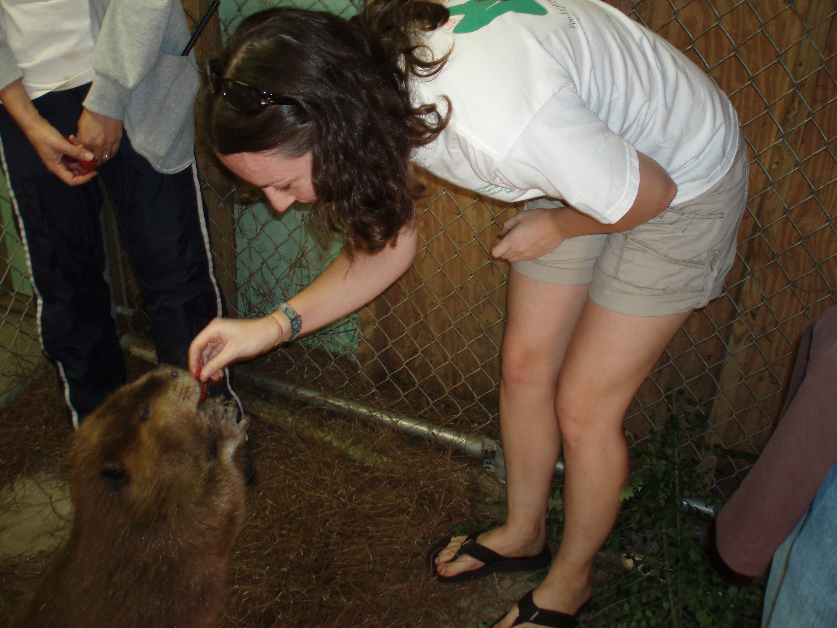 I was on a site visit to a nature center, and they had this hilarious beaver, so I got a picture of me feeding him a strawberry -- he wasn't pushy, he just stood on his hind legs and sort of made bitey faces in the air until a strawberry appeared in front of him -- he also made really funny noises that are hard to describe but reminded me of a constipated person, if that helps...