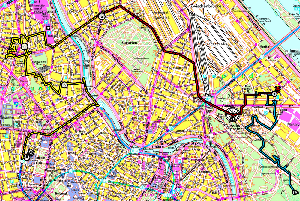 After meeting in the Prater and receiving our ribbons, maps and instructions, off we went in the direction of checkpoint 1. We managed to escape from the chasers on and around Prater Hauptallee by mixing in with the crowds in Wurstelprater. Paranoia was rising, even the slightest hint of something red made us jump... ties, caps, bags, shirts... luckily no red ribbons. Things got worse after crossing Ausstellungstraße. Our first attempt to reach the checkpoint on the direct way was thwarted by a chaser and our group split up fleeing in different directions. Taking a detour coming in from another street and a final sprint passing some chasers brought us to the safe zone of checkpoint 1.