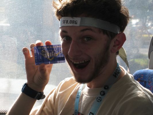 At Defcon there is a event called the black ball in which you must wear somthing clever in order to get in. So me and my friends decided to wear black garbage bags and duct tape assorted items. One of the things I ended up making for myself was a bandana made out of duct tape. When I went up to my friends room (evil mofo) I noticed he had SF0 stickers. So I decided to put one on my bandana and there it remained for two days straight as I walked amoung thosands of people. It was not till later however that I realized that this might be good proof for this task so one could say I accidently spread SF0.