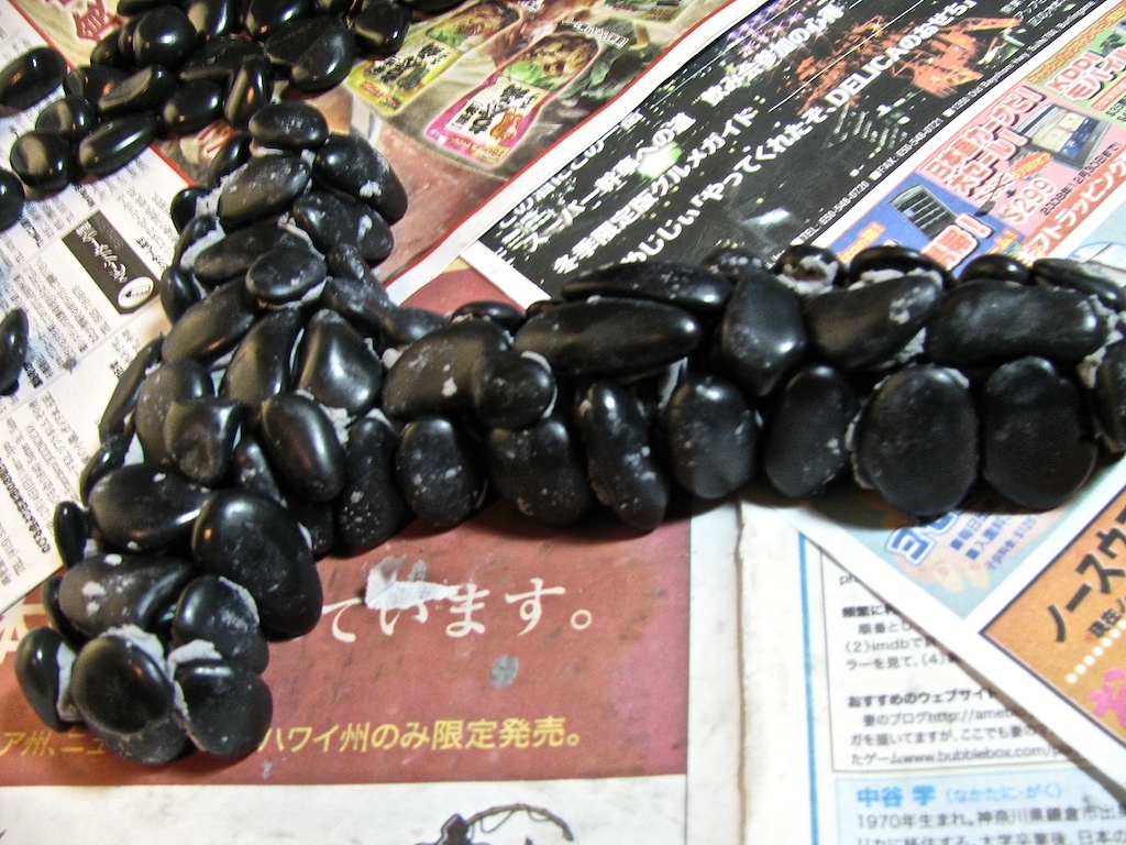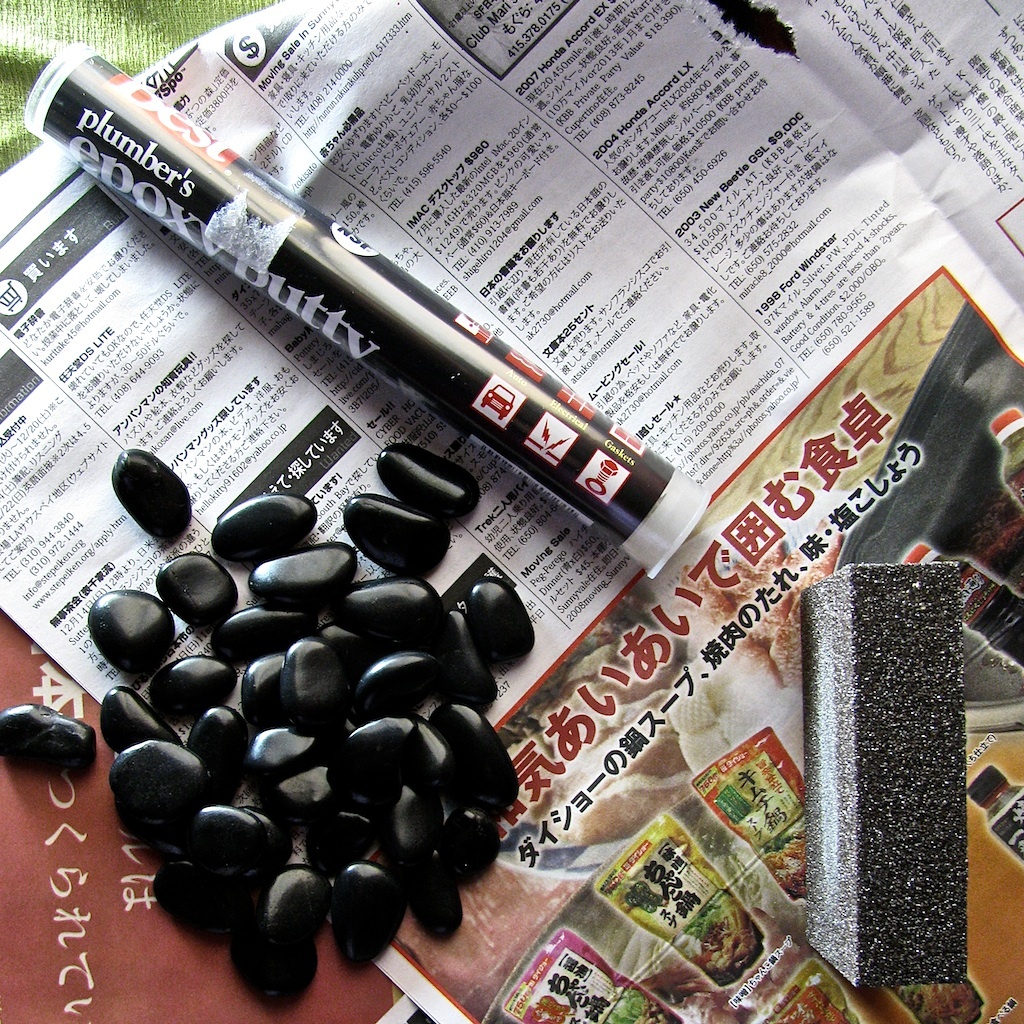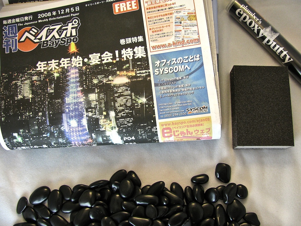 This seemed like a fun task, but pretty much immedietely I ran into a problem: it's impossible to find rocks laying around in the city! Feeling particularly metrosexual, I bought a bag of polished rocks at the japanese hardware store for $3.50 - along with the other materials for the project:
