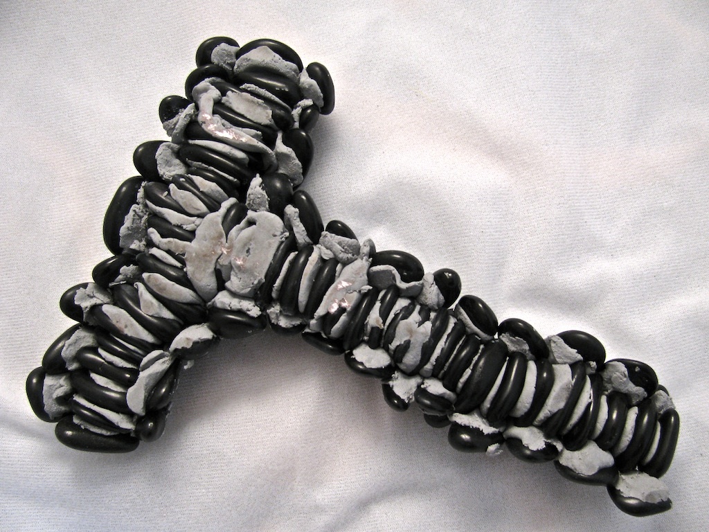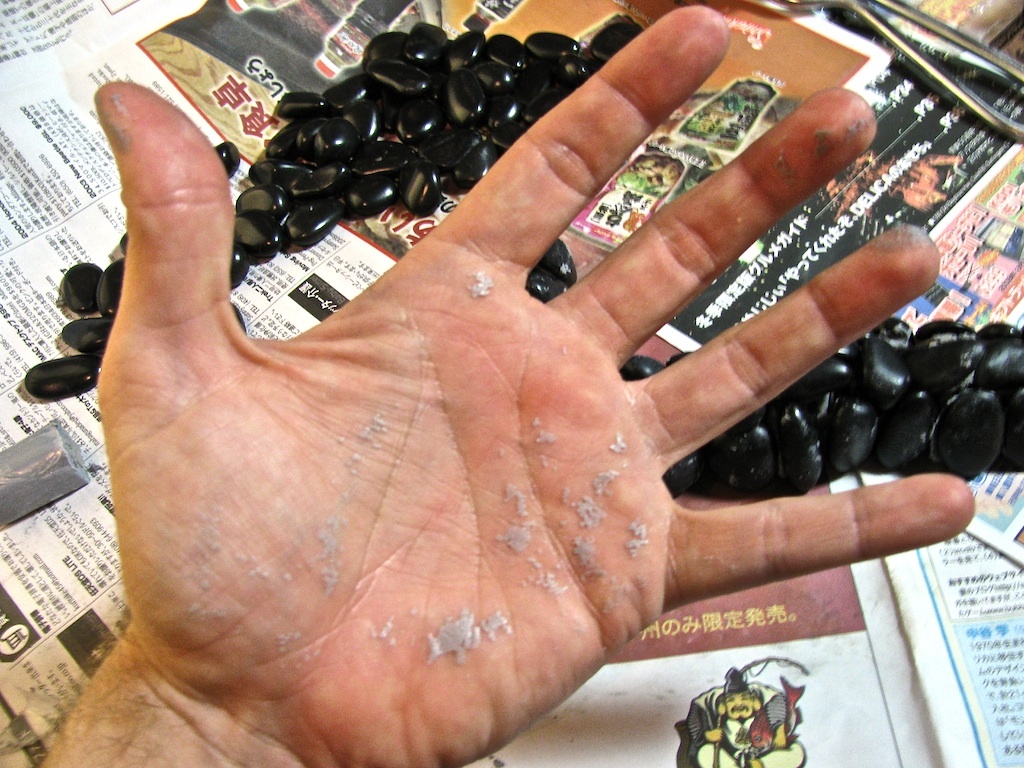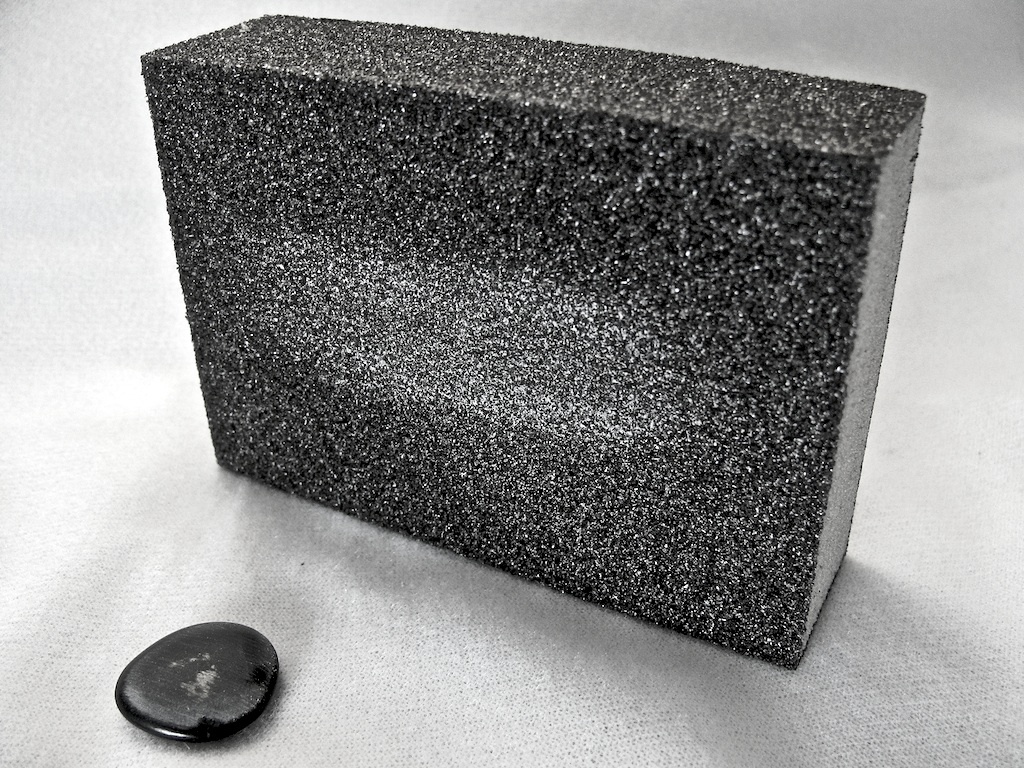 The first thing to do was to sand down both sides of the flat stones so they'd be more pourous and better bond with the the epoxy putty. Each one got the go over with the sanding brick: