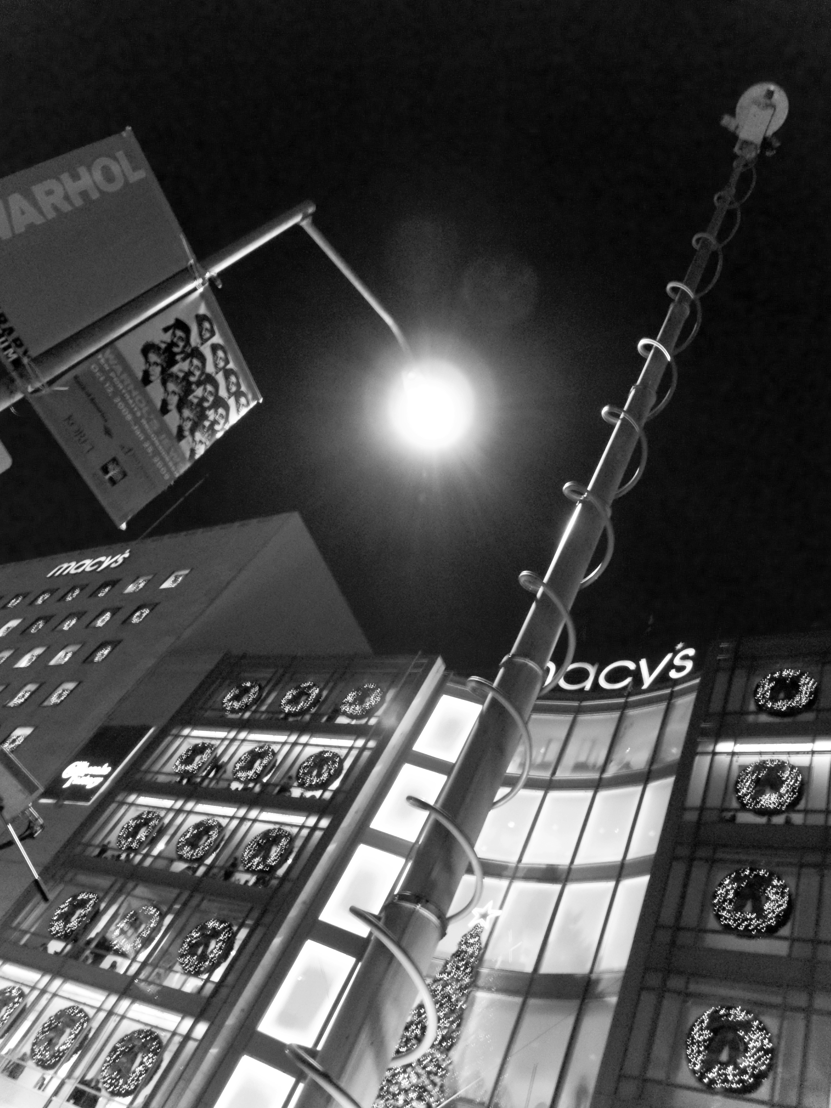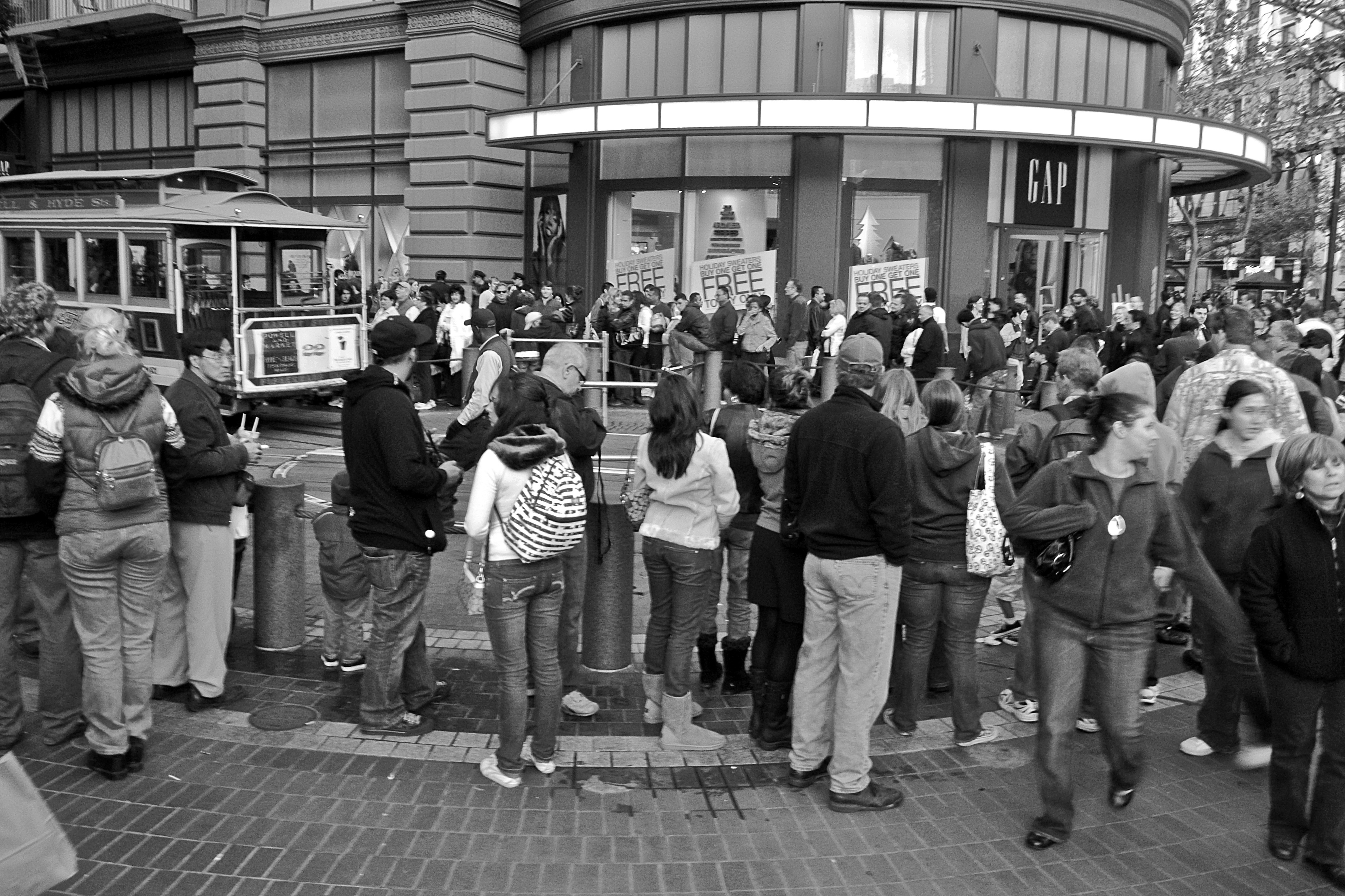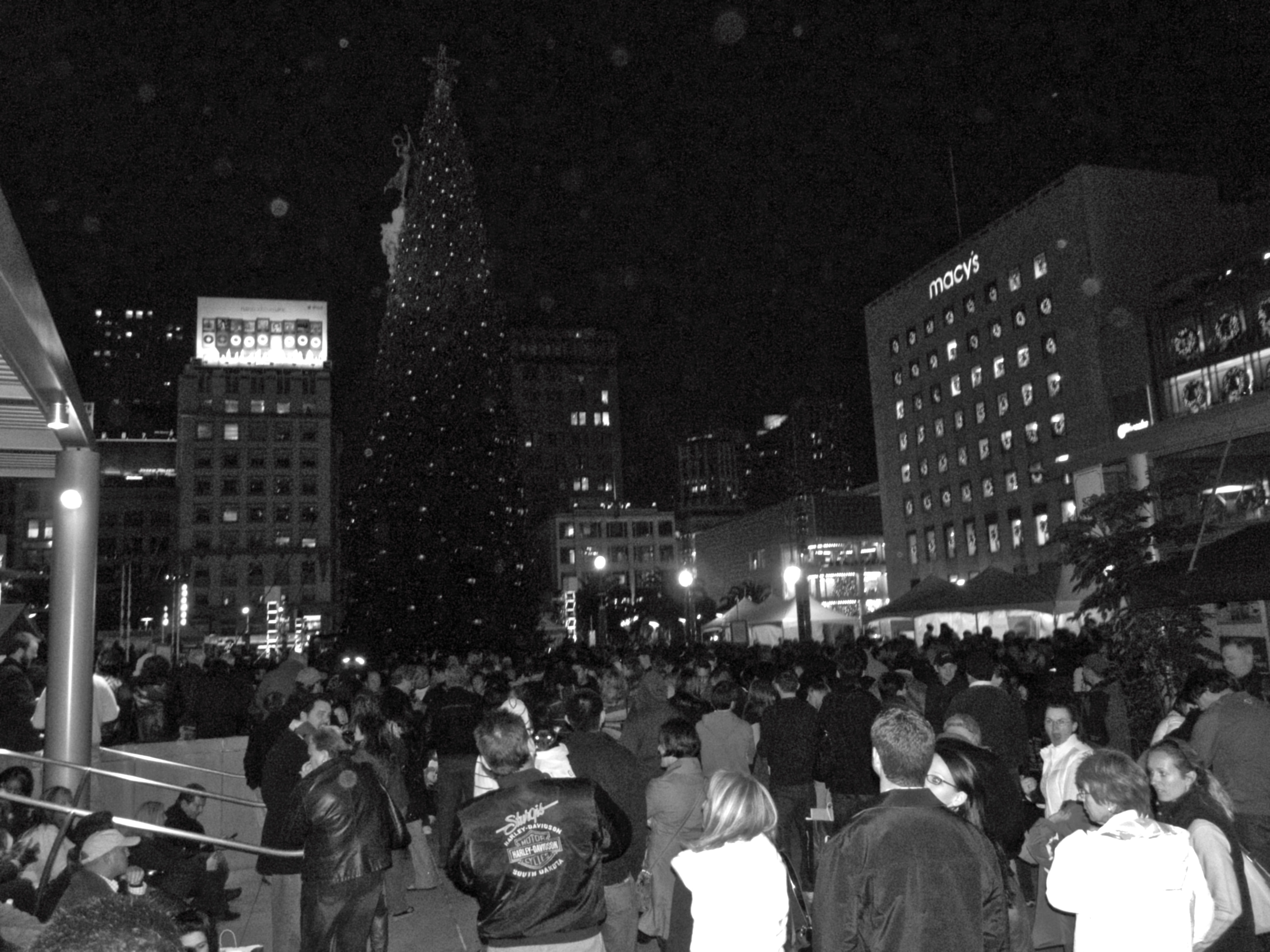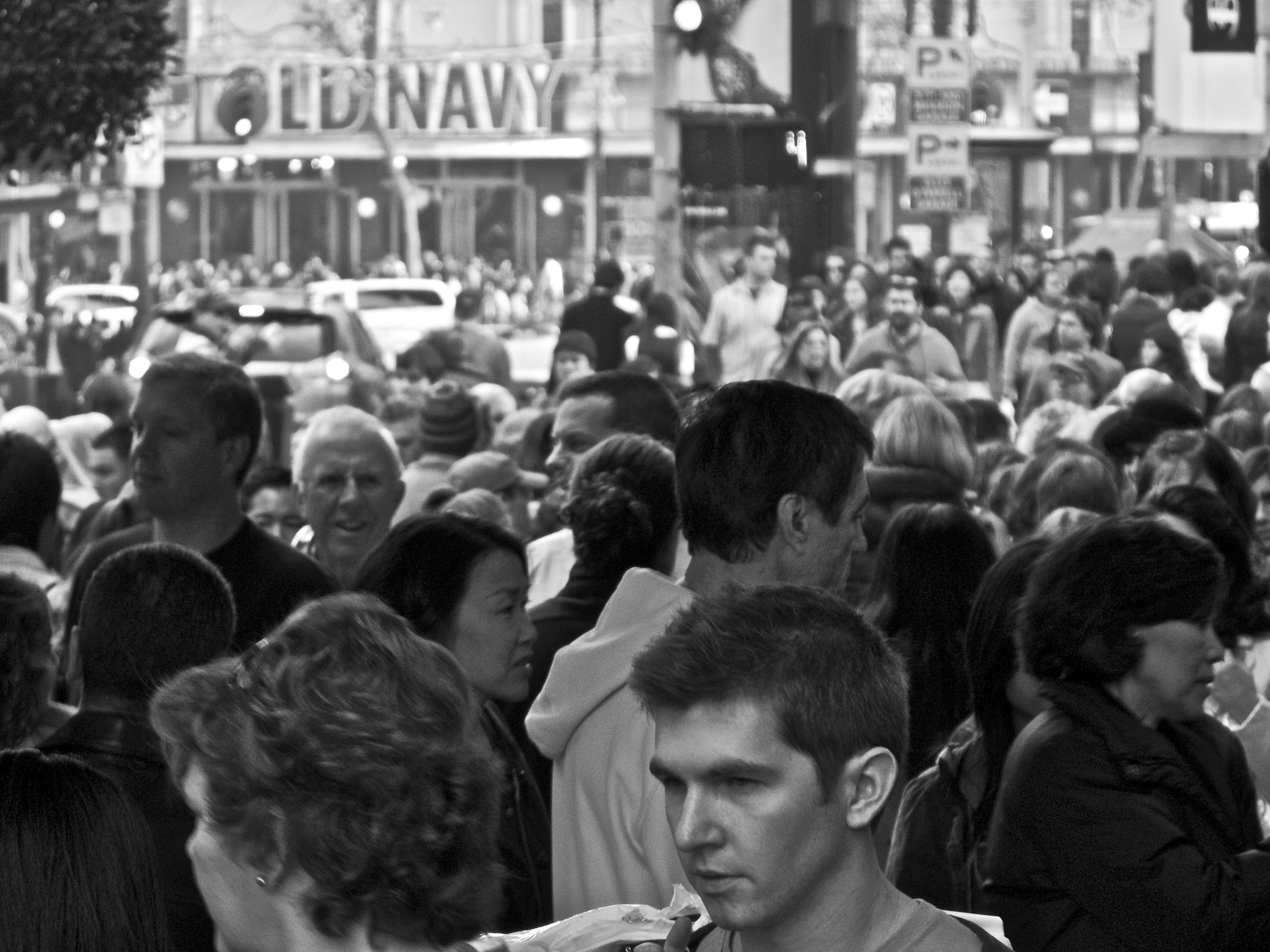 After donning my social anxiety sunglasses (hide the eyes! hide the eyes!) and grabbing my trusty digital camera (elmo), I hit the street. I began ambling towards my street corner of choice in downtown San Fran. "This will be easy", I cackled to myself - practically savoring the taste of the 15 crunchy points in my mouth. I turned the last corner, and then I saw the crowd. "Goddamnit!", I swore, "It's fucking black Friday! Now I've got to wade through all these freaking people" After wading through a barrage of very busy looking shoppers I arrived at my destination:
