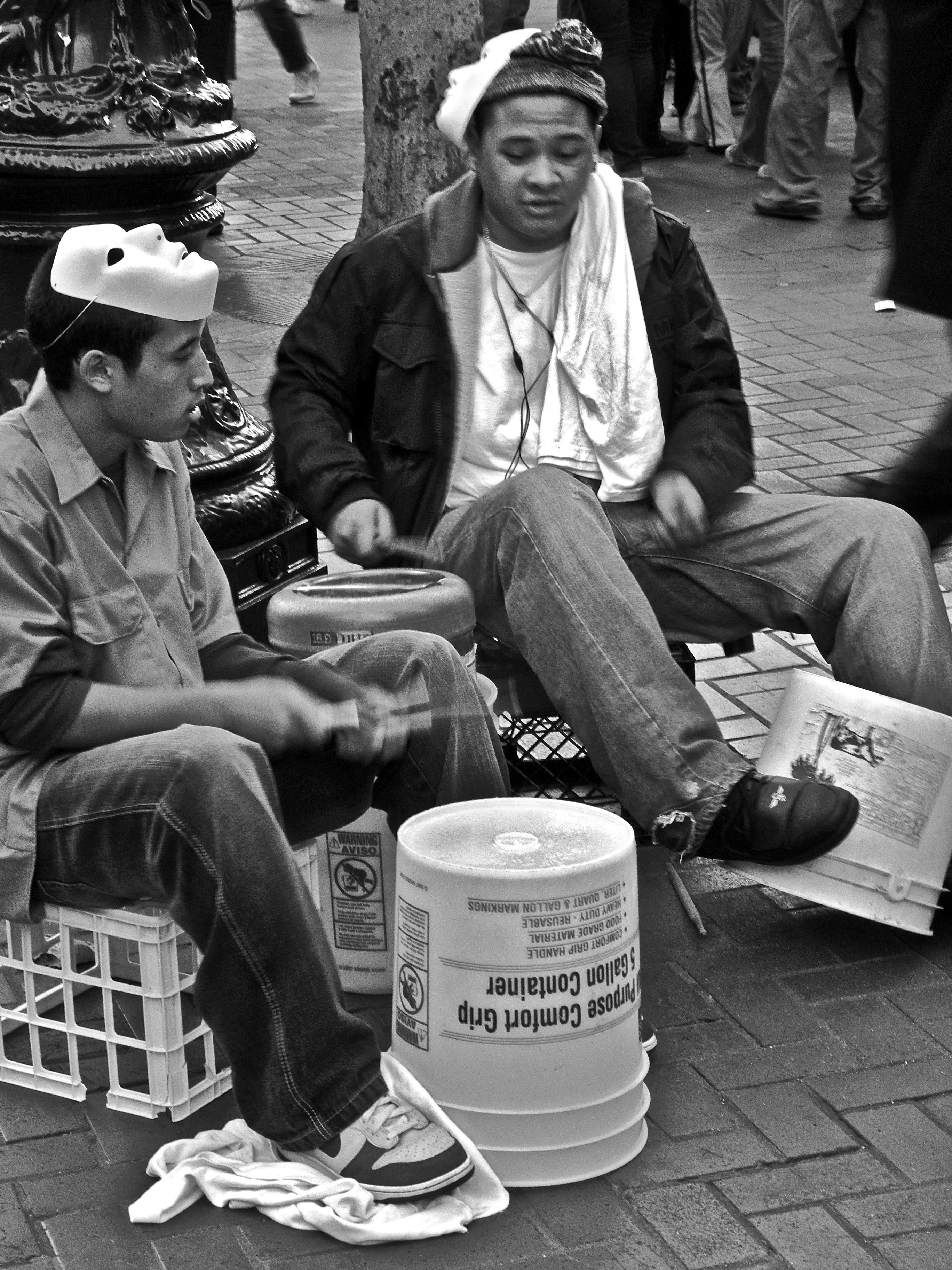 .... but on the other side of the square, these fools were drumming away on buckets! Freakin buckets! The guy on the right kept getting fancy by turning the bucket with his feet.... "Big whoop, fella, you should have seen the moss ant I saw between the bricks on the gap building". I need to get away from this, I'll take the escalator down to the bart station and get a coffee and regroup.