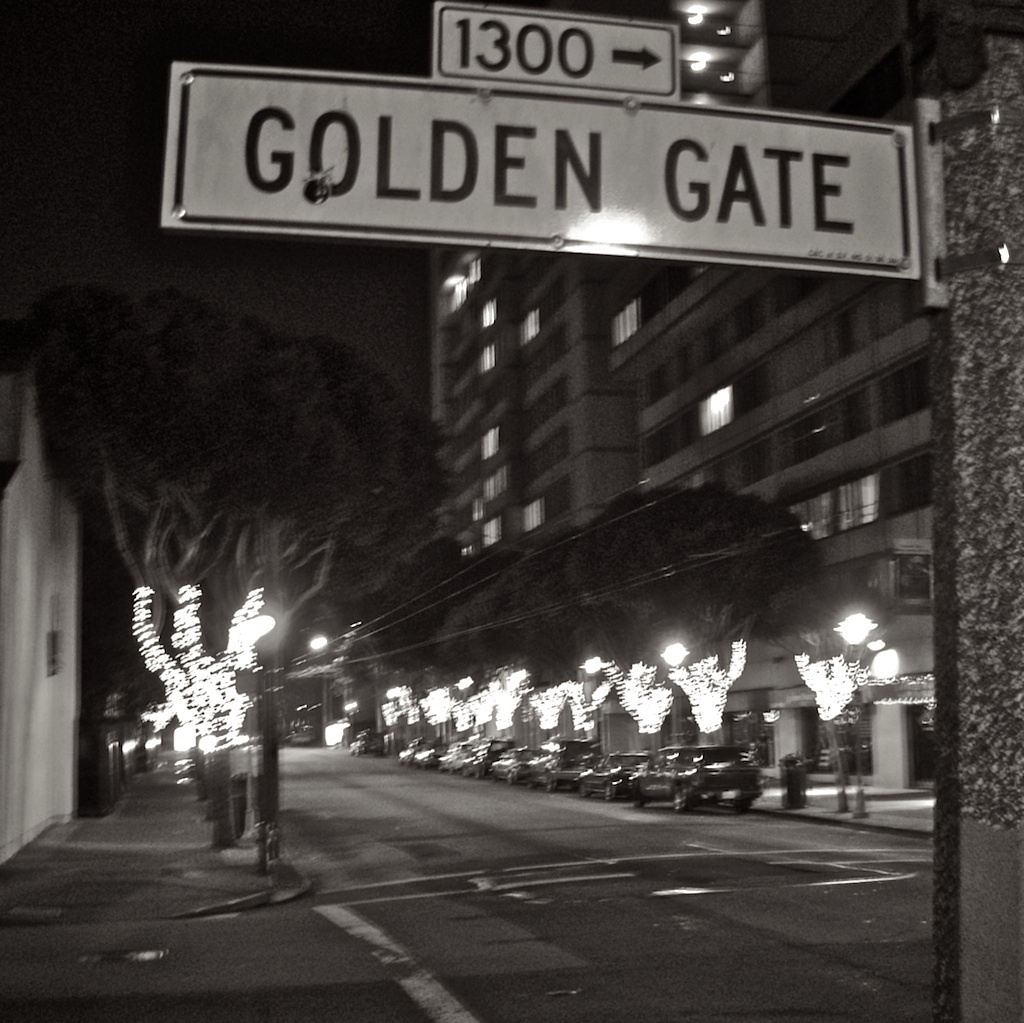 After walking until my feet literally had blisters, I headed over to my target destination at about 1:30am - the little 'park' at the corner of Webster and Golden Gate. I chose this particular park because there are a lot of benches, and usually around 3-5 homeless folks sleeping here every night. The neighborhood in general is completely devoid of Christmas lights. I step through the park quietly, trying not to wake any of them, but stupidly trip over one of their bundles of possessions, which elicited a 'grunt' from it's sleeping owner. I pick my target, the tallest tree in the park - a fine specimin for a christmas tree and after 3 tries finally manage to hang my shoes: