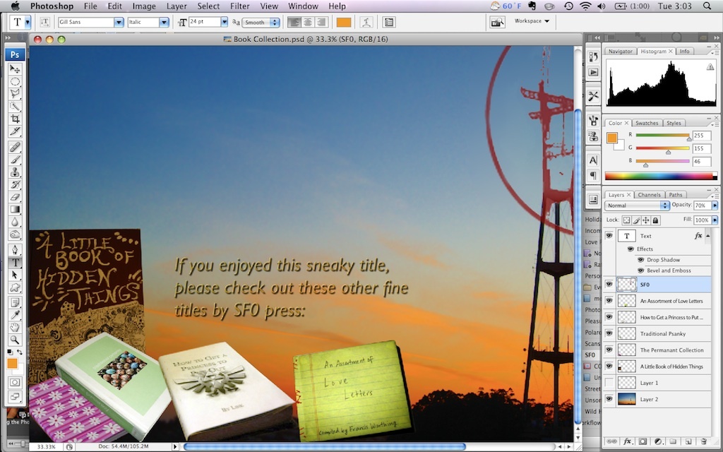 I took all of the pictures that I used for the book over the last year or so, with the exception of the Sutro Tower image that I used as the background for the catalog page. I found it on flickr's creative commons search - here's the original taken by Tolka Rover, before I cleaned it up / photoshopped in the logo/books/text.