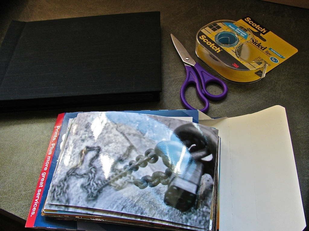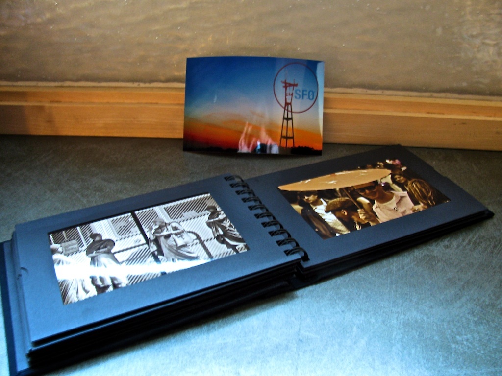 I uploaded the photos I'd chosen as well as the SF0 plug page to the Walgreens photo lab down the street for printing. I picked up the prints and got to work. Materials: Black 4x6 landscape photo album Scissors (not actually used here) Double Sided Tape and of course the freshly printed photos.