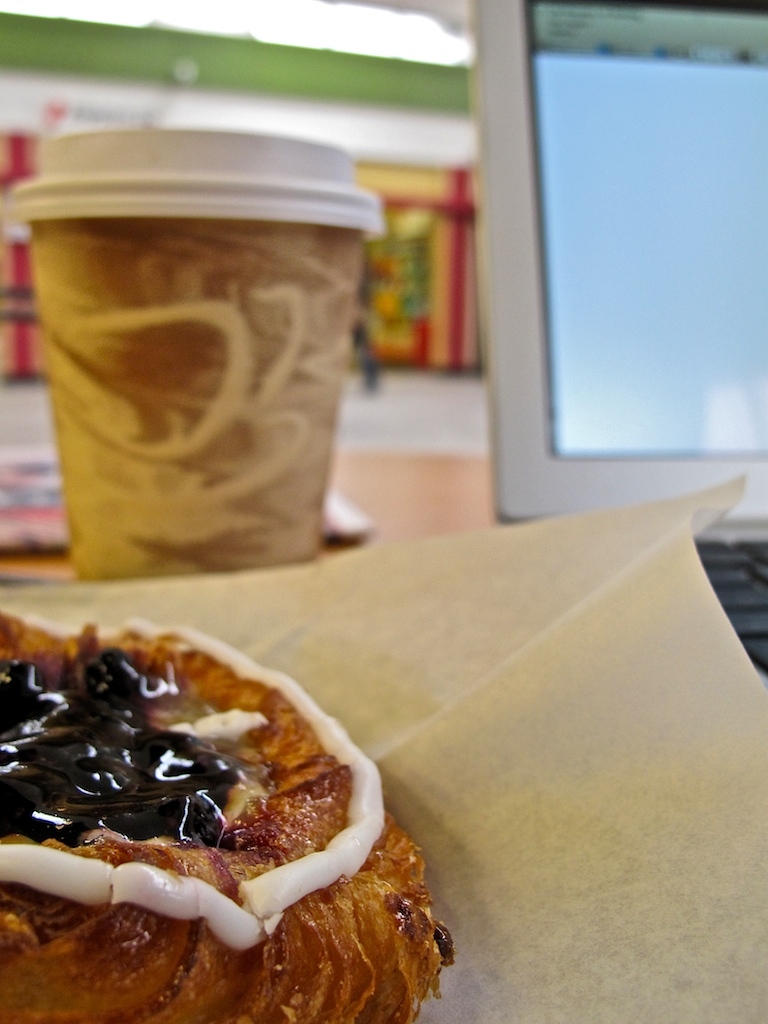 Got a few more proofy snaps. Something is going to have to save the lack of style with this writing. The gal behind the counter is chatting with an older man reading USA today. I can't hear what either of them are saying, but he uses a lot of body language, and waves his eyeglasses around wildly, occasionally putting them back on, presumably so he can take them off again for effect. He flips to the sports page, and picks up his almond covered pastery.