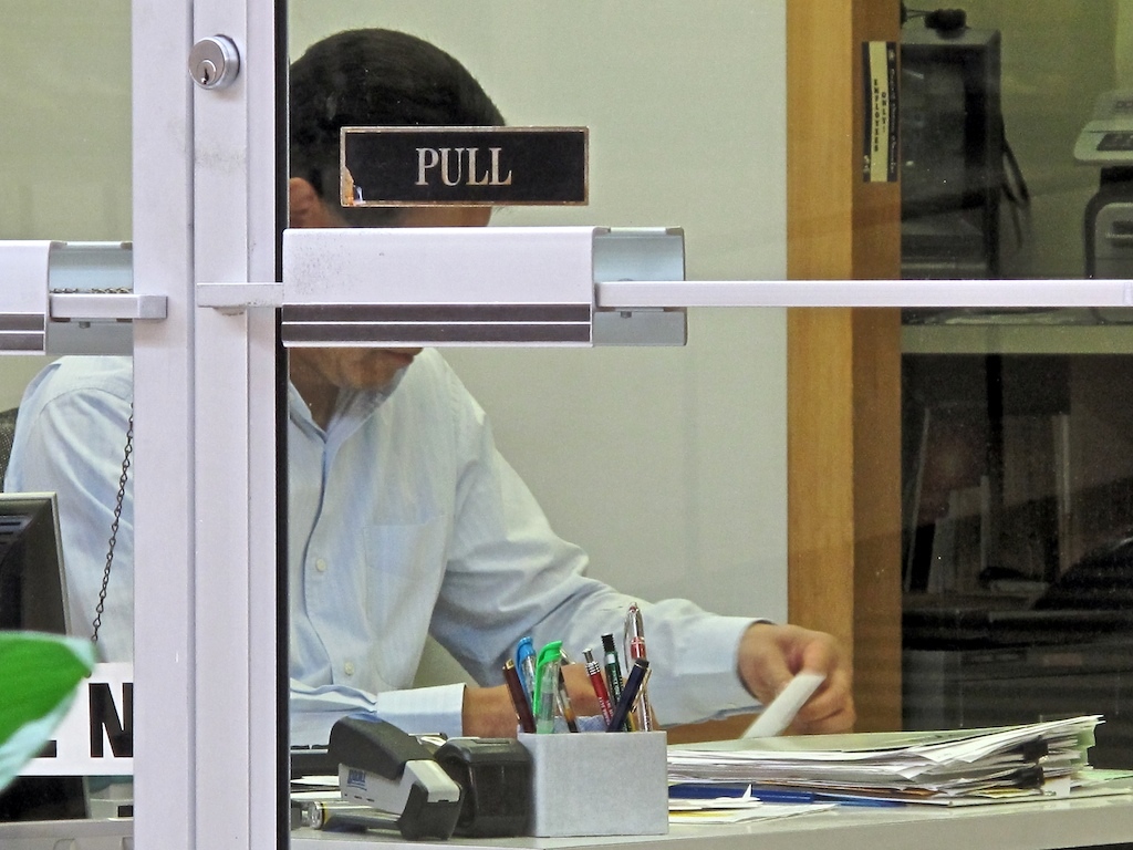 A man sits behind a desk, which is behind a sign that says 'open', behind a glass door. He's working on paperwork of some kind. Stacks of files in front of him, and he seems to go through an endless number of post-it notes. Is he filing stuff relating to flower arranging? I never knew it was so complicaed.