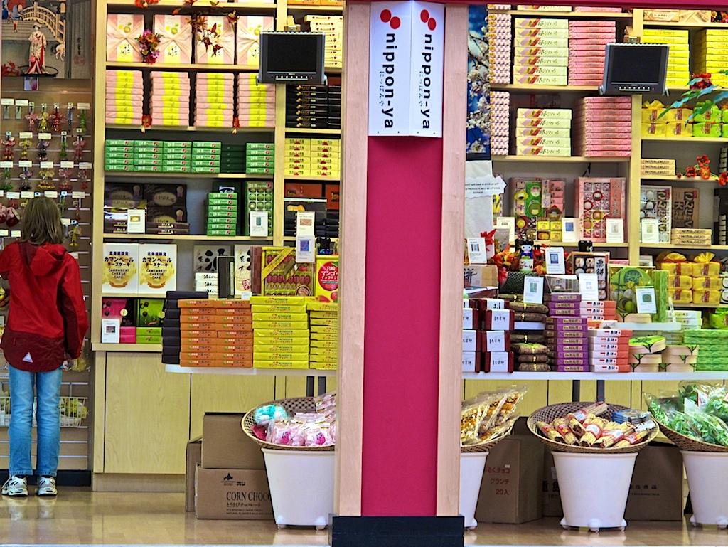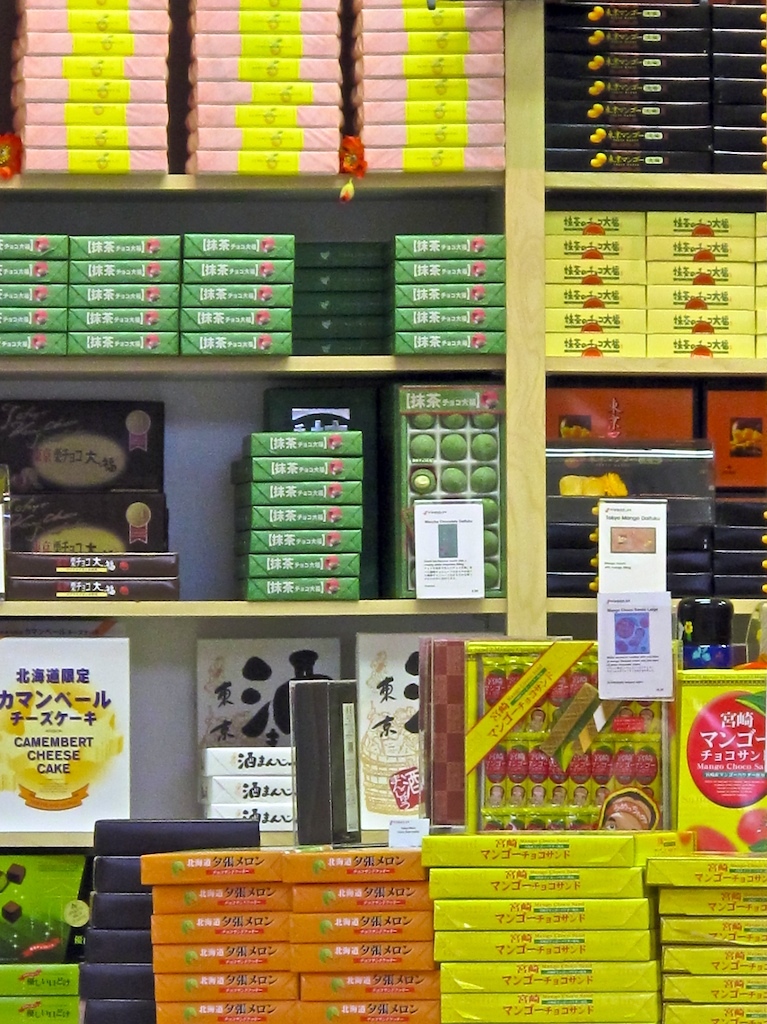 Small pink and green stacks of confections adorn the walls of nippon-ya, which is currrently empty.