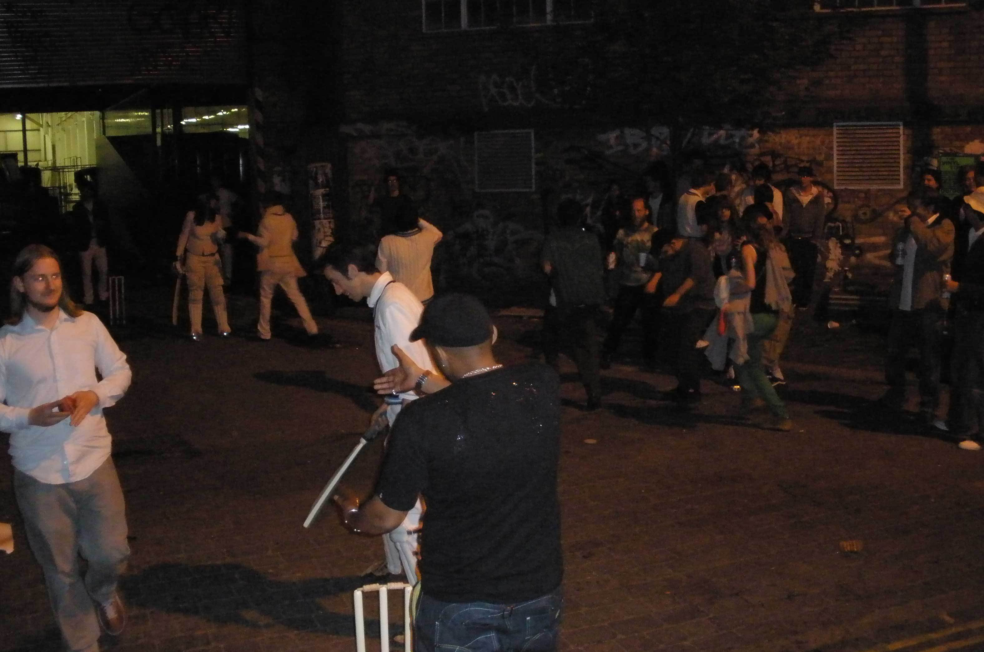 I'm not sure how the capitalists managed to keep enough fielders playing, even after 4 hours or so, when we moved from Spitalfields Market to Brick Lane. It was probably easier for them with all the club traffic... (for a fuller description of how the Anarchist vs. Capitalist cricket works, check here (the first one we did) or here (the last one until now).