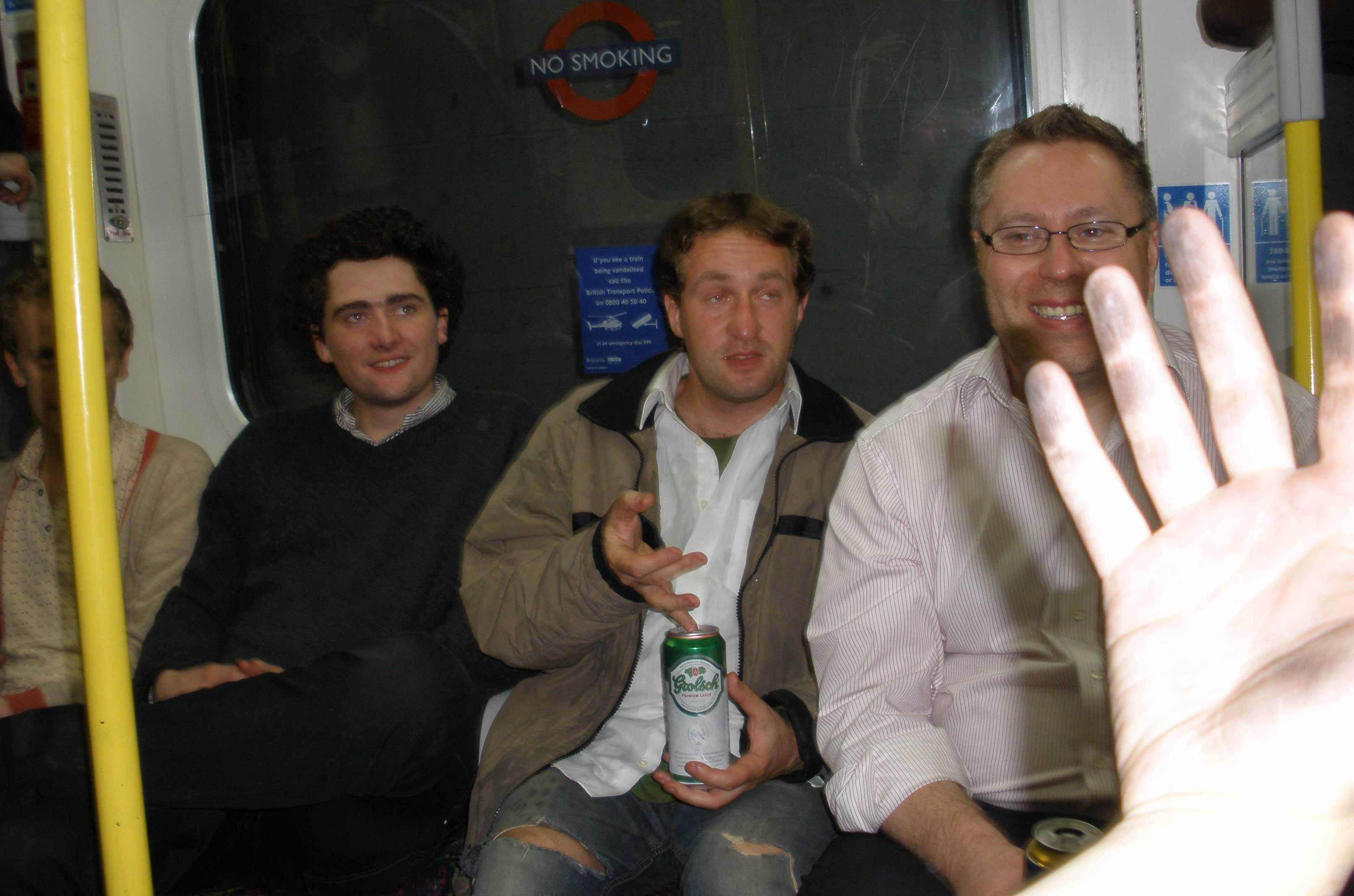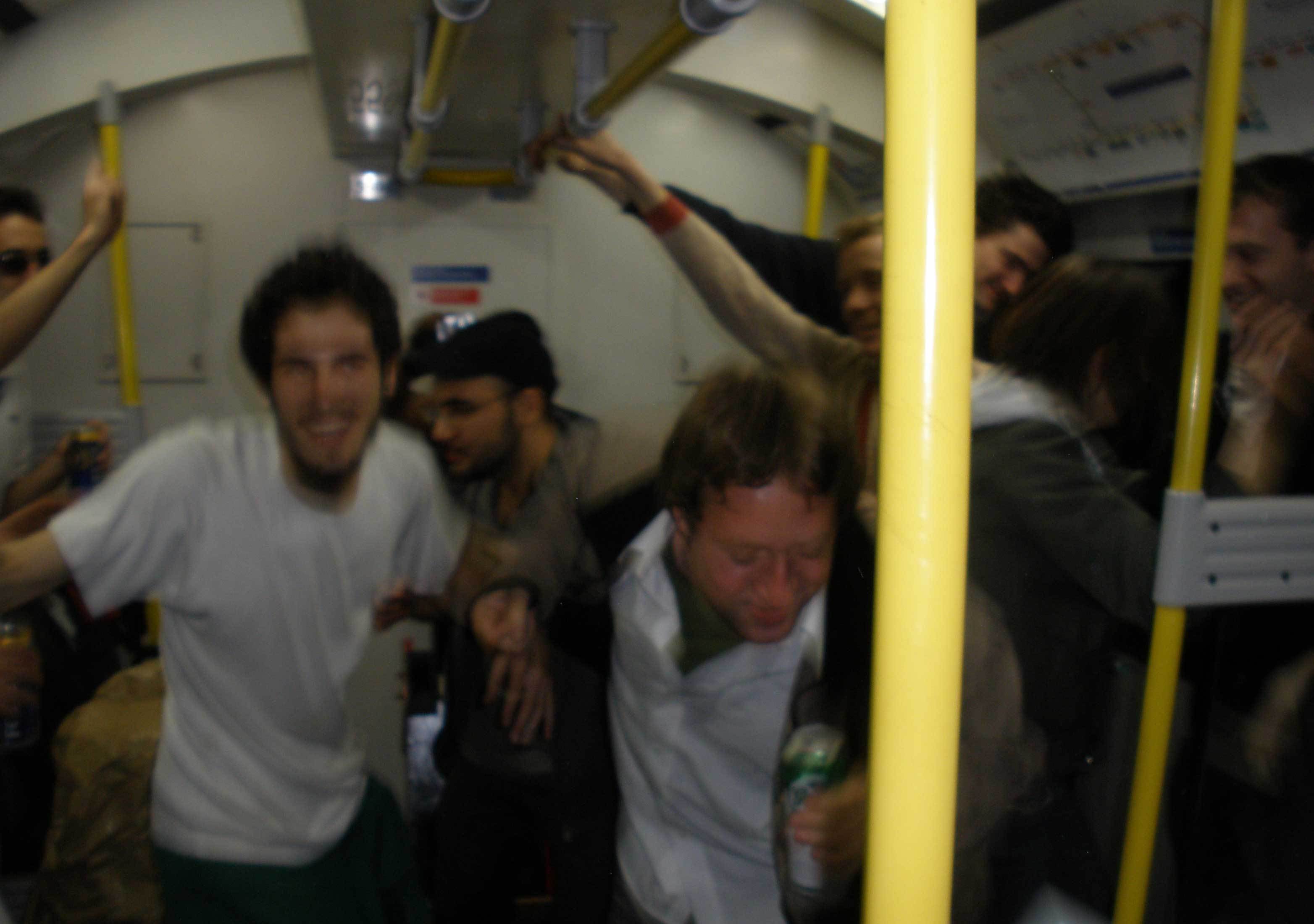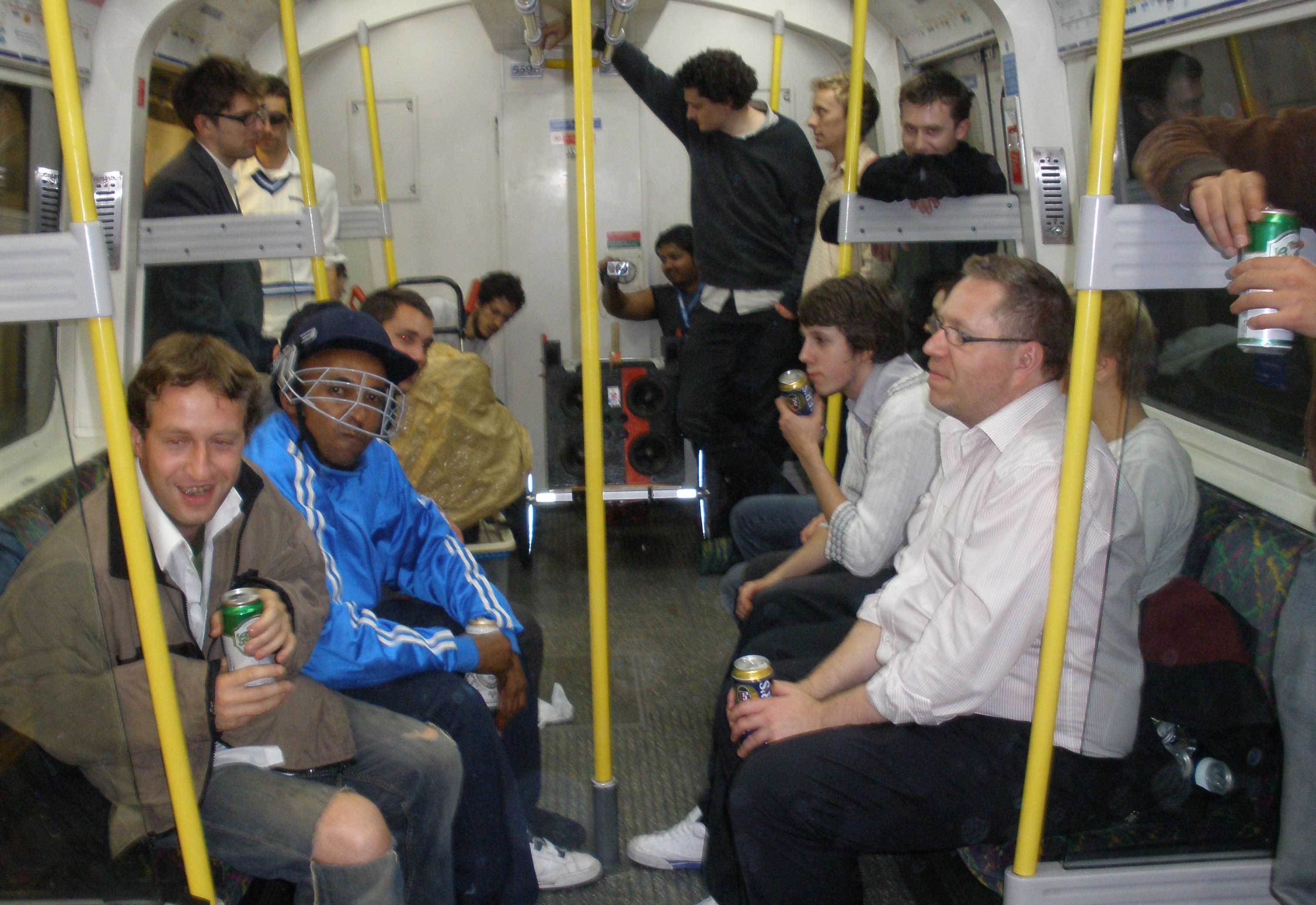 I think I was trying to take a picture of my dirty hand. It was dirty from playing on the floor too much, but also especially from the trampoline/slide/tarpaulin thing we'd been playing cricket on earlier (read on). Sadly someone's flash washed it out and you don't get the full grime effect. Incidendally, I think those two guys in the middle were just random passengers who joined in. Not sure entirely. There were two Canadian women on their way to catch a flight to Edinburgh for the day, who were quite delighted when we told them that they might catch another party on the tube that night.