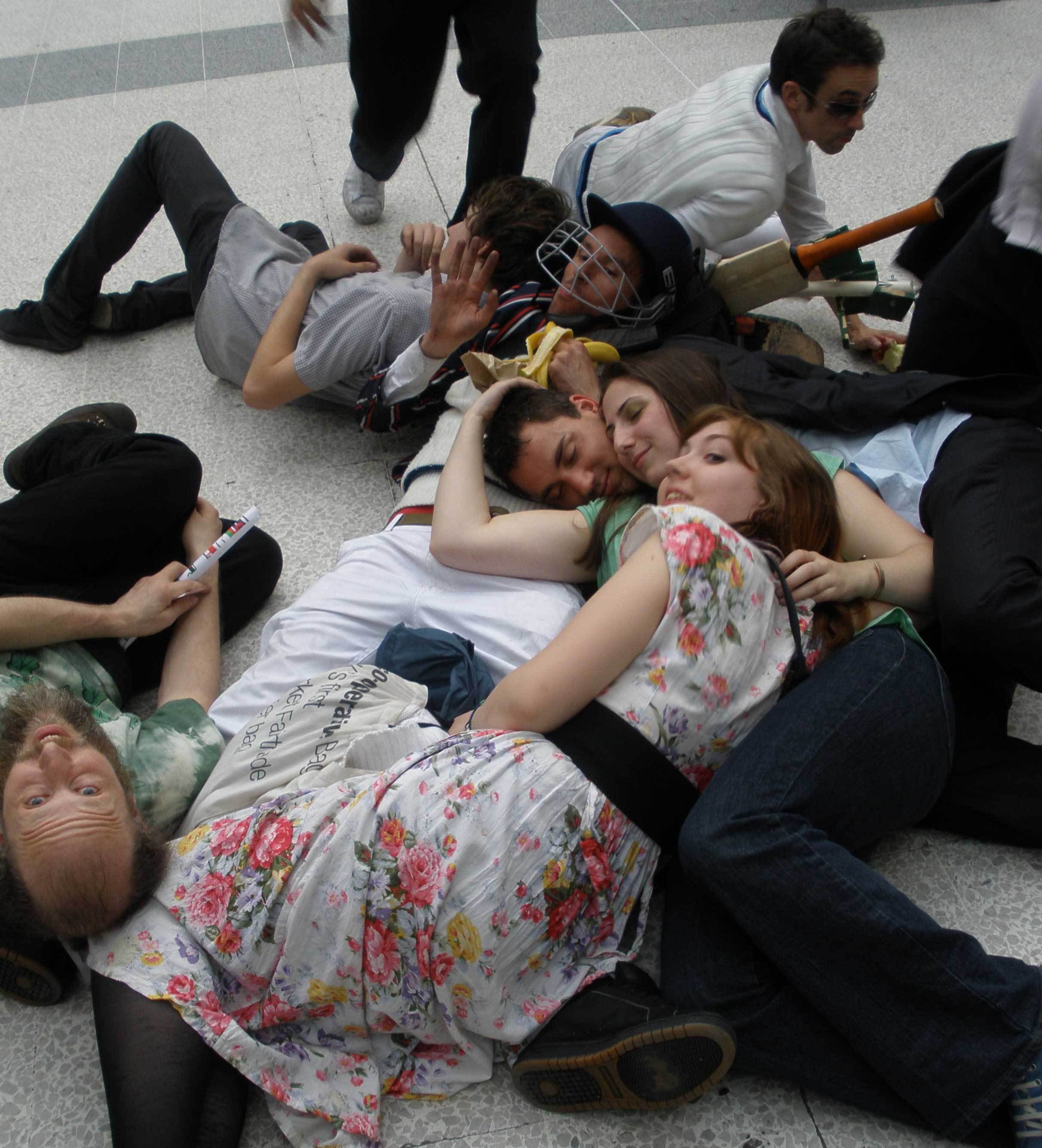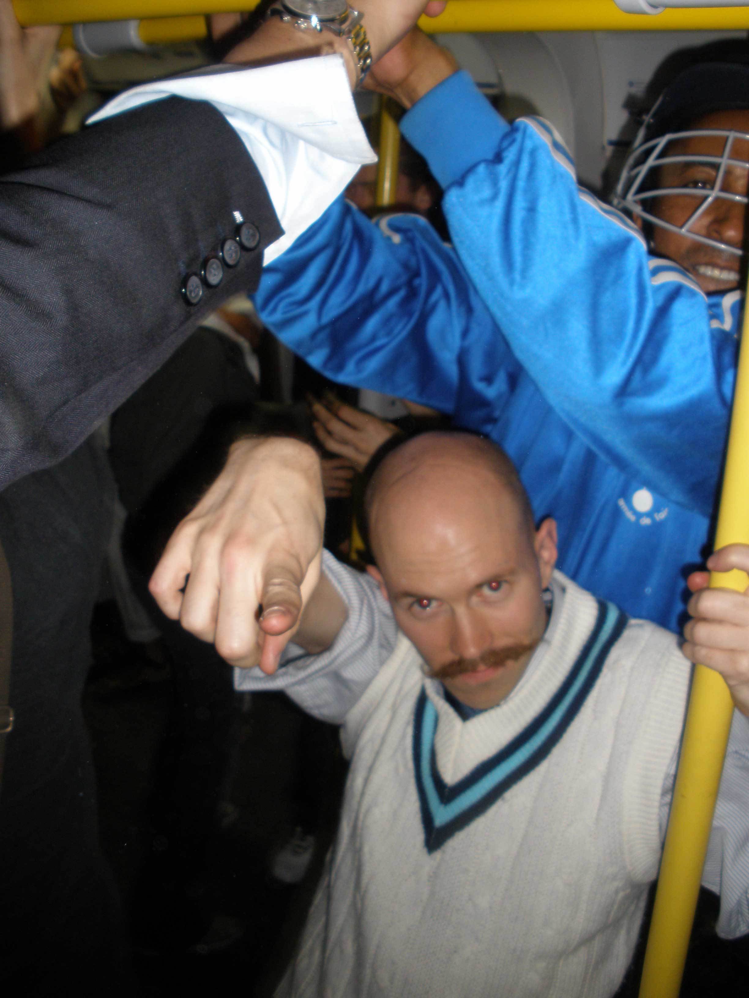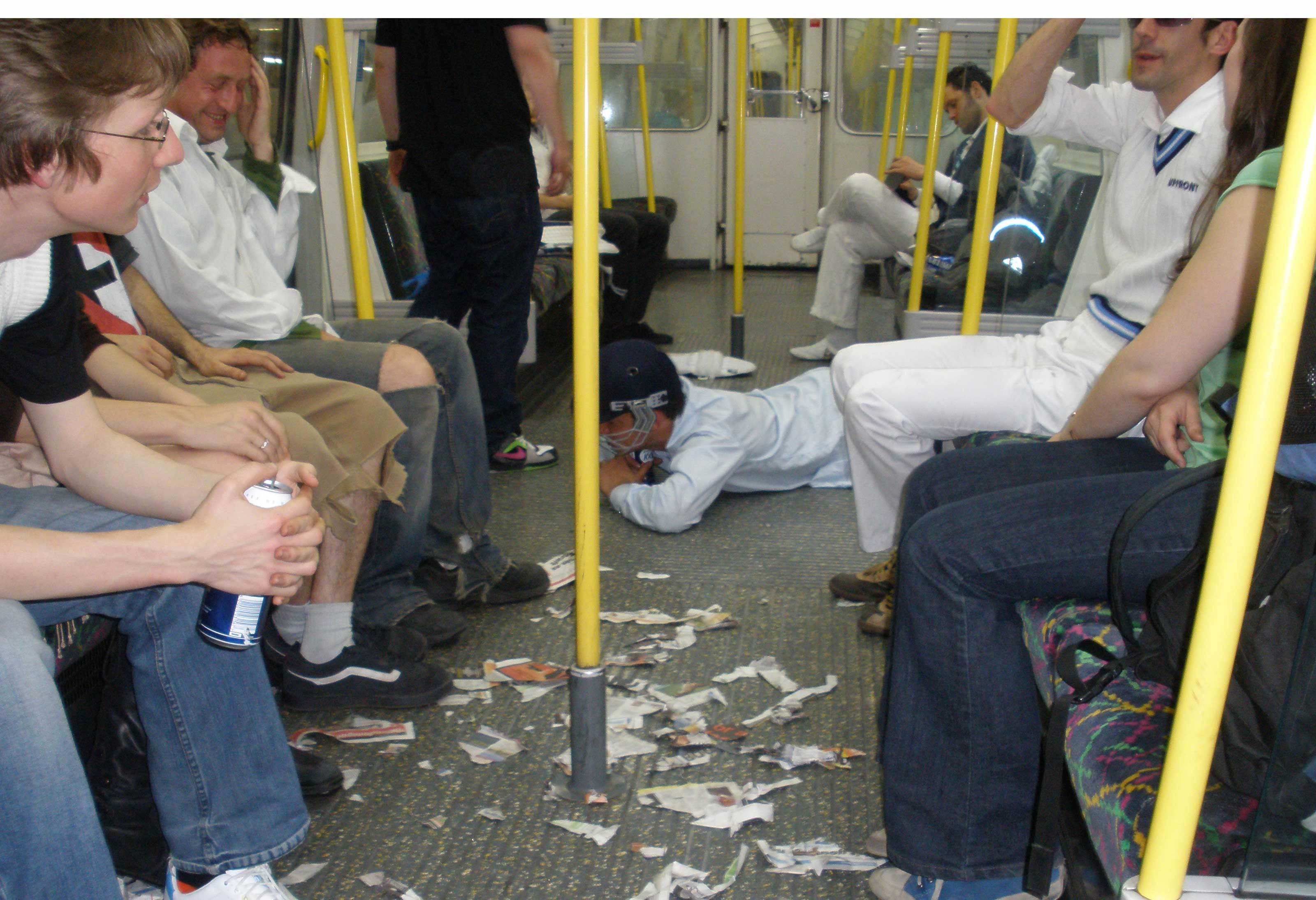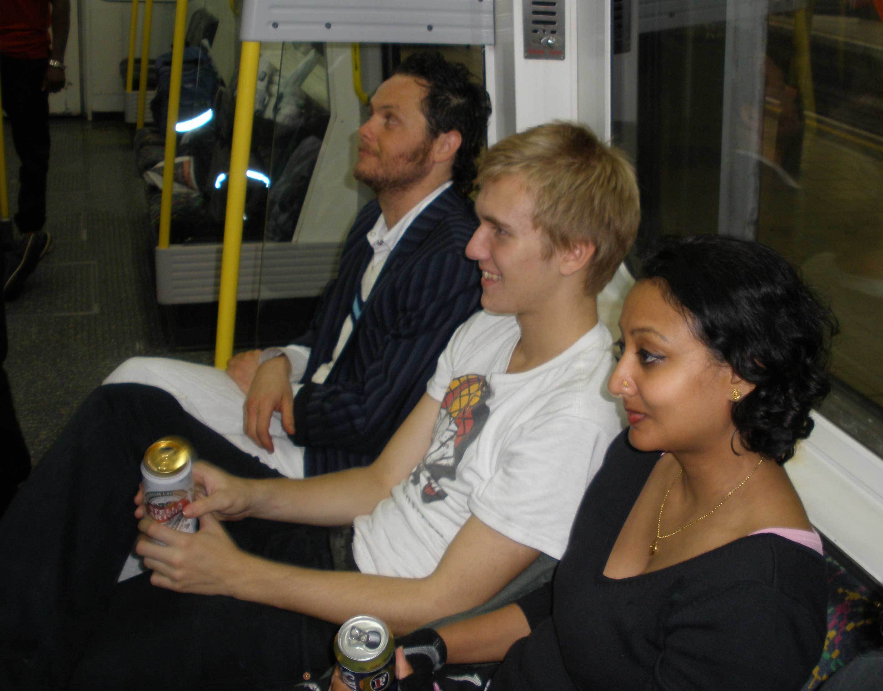 I think I was trying to take a picture of my dirty hand. It was dirty from playing on the floor too much, but also especially from the trampoline/slide/tarpaulin thing we'd been playing cricket on earlier (read on). Sadly someone's flash washed it out and you don't get the full grime effect. Incidendally, I think those two guys in the middle were just random passengers who joined in. Not sure entirely. There were two Canadian women on their way to catch a flight to Edinburgh for the day, who were quite delighted when we told them that they might catch another party on the tube that night.