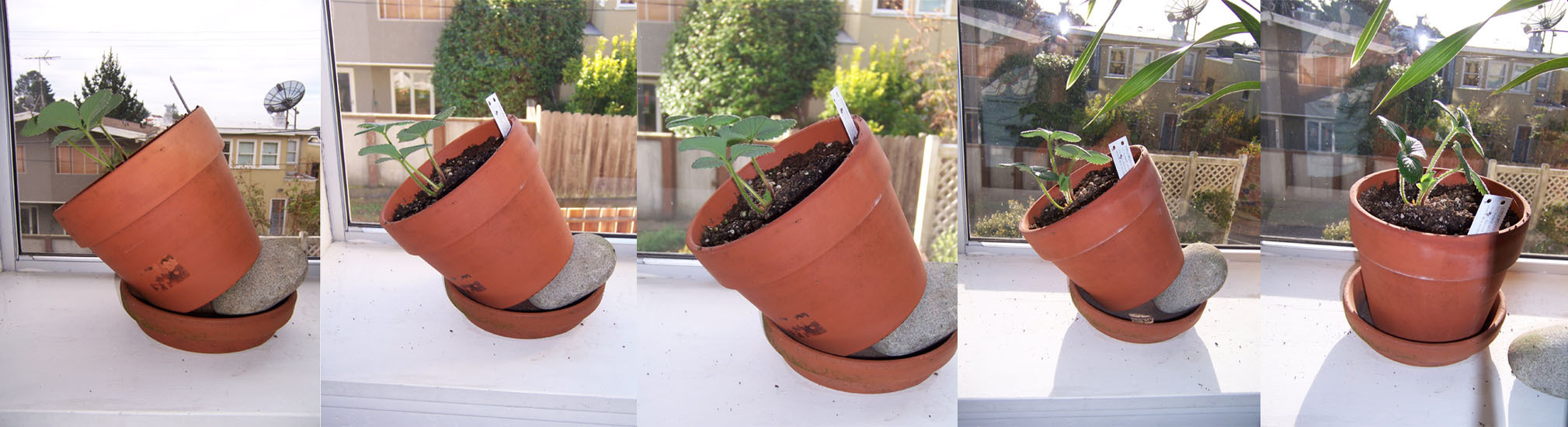 In this experiment, we can see that the strawberry plant from Sloat, originally has it's three leaves pointing upward. However, when tilted at roughly a 40 degree angle the leaves not only move to face the sun, but also the stem bends in accordance with gravity. In the last section, it can be observed more easily when the pot is once again placed on a flat surface.