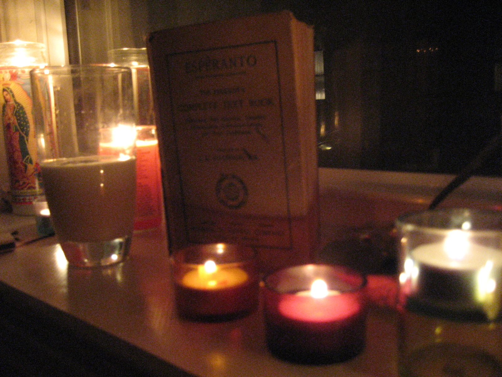I killed the lights in my apartment and biked over to a classmate's place for a house-"cooling" party. It was a small gathering of demure art students - we folded some tamales, set them to steam, then killed the lights, lit a roomfull of candles, and bitched about the iniquities of Chicago. Wonderful food, the most incredible horchata I have ever tasted, followed by truffles and the thickest Ibarra hot chocolate. Thanks EV for the exquisite party, and for having an Esperanto text book on the same shelf as Céline's Journey To The End Of The Night.