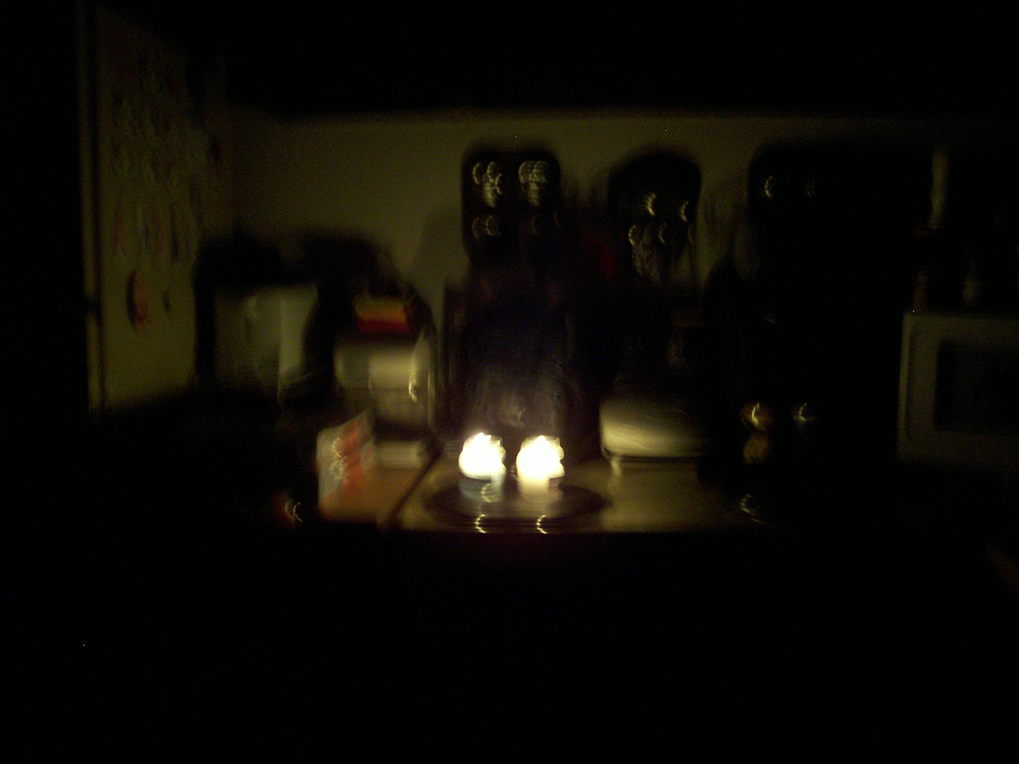 And this second shot was taken with a regular exposure. which is a far better example of what it was like. You'll notice that all that was visible are those two strange lights up on the hill. It was nice being in the dark like that. And with the cloud cover there wasn't even moon or starlight.I was so glad to have completed this task with a large bunch of other players because if I had done this alone, it would have been lame. Just me alone listening to a podcast does not make for good praxis. Although to make it a bit more exciting, I took down my electric candles that I normally use to light my place. I use christmas lights and electric candles as my only source of light in my room. I disconnected the electric candles and unplugged the christmas lights. I lit three candles and put on the podcast and laughed to myself in the dark, just like Minch Niddle was doing about 370 miles North. I also turned off every single thing that uses electricity, I turned off my power strips and everything. I found the whole experience rather enjoyable. But not much different from a regular night for me.