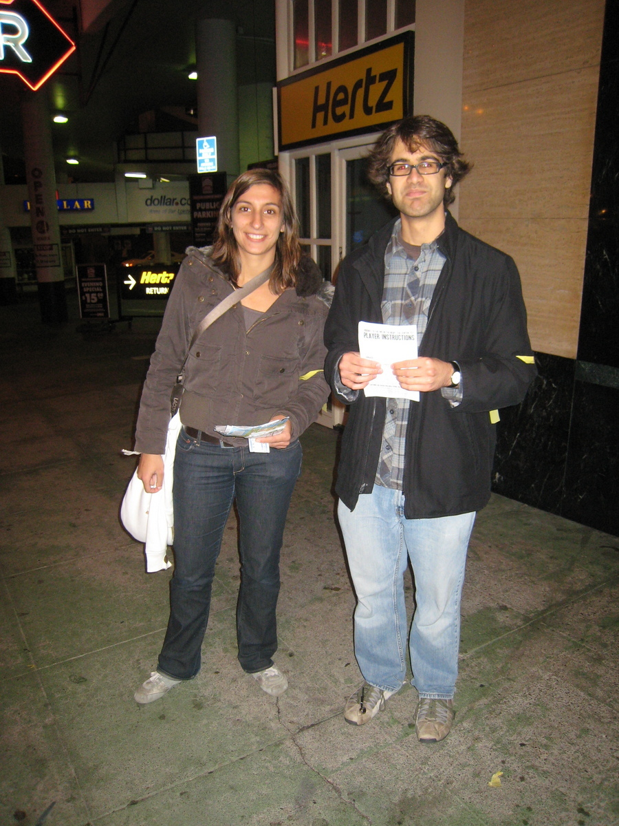 Actually, originally, the friendly security guard told us that the top floor of the garage was reserved for the Hertz rental staff for the whole night, but that we could continue to run our game on the 7th floor, which was public parking. By this point Rabbit had arrived to see if we needed any help, and Spidere asked him to go down the elevator to wrangle runners attempting to come up, and let them know the new arrangement. Meanwhile, Spidere and I finished with the last remaining people we already had in line, packed up our bells and zipties and drove down to the 7th floor.