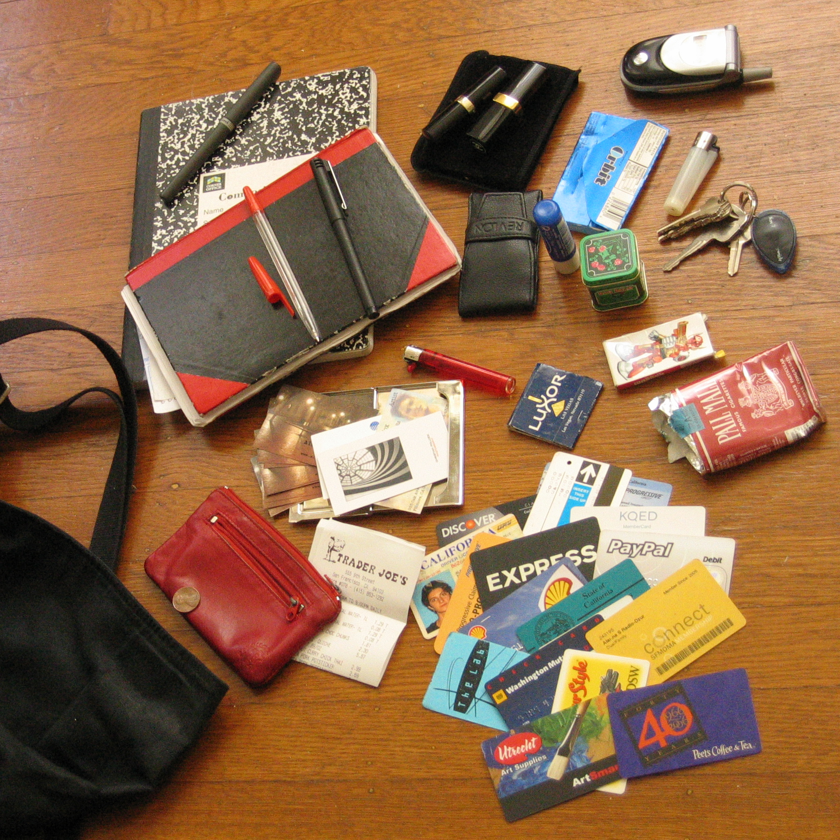 credit cards, driver's license, gas card, car insurance, two atm cards, one from Payal, state med-card, KQED, MOMA and Lab membership cards, BART ticket, Peets gift card, DSW membership & Utrect club card.