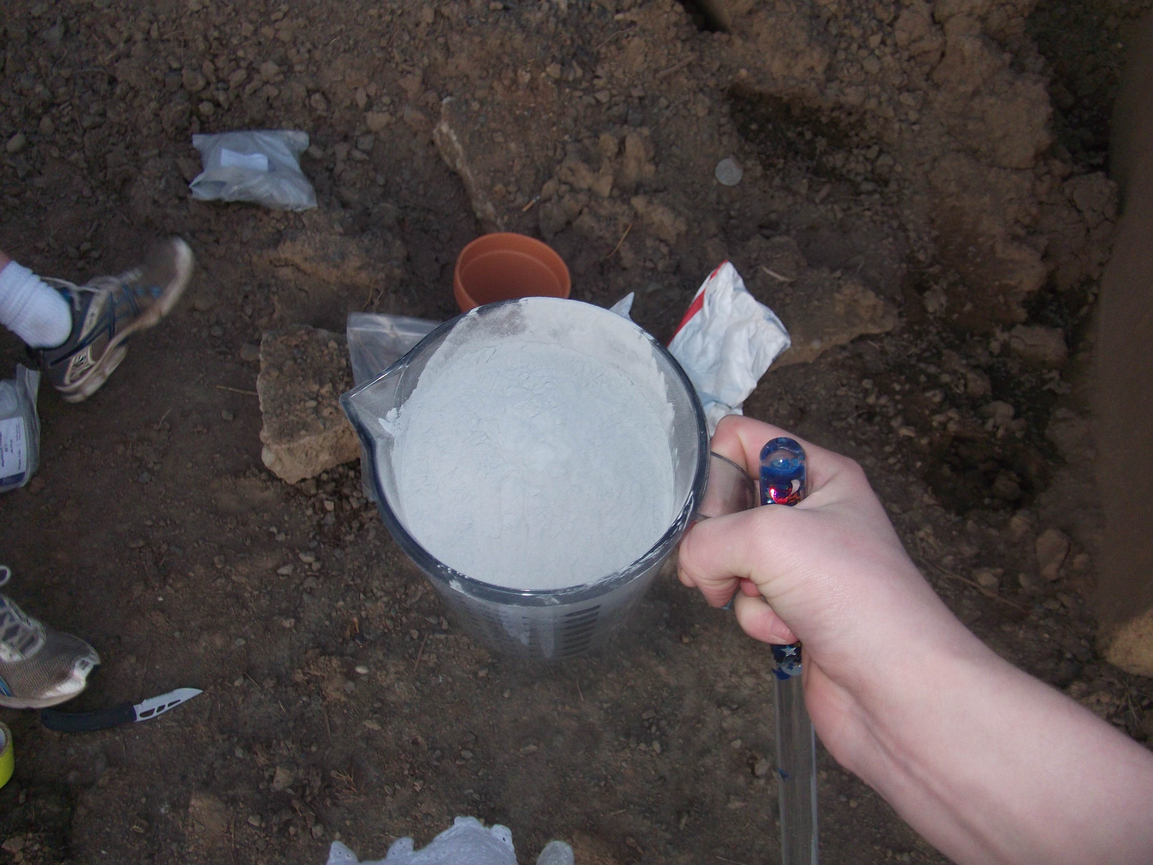 We filled approximately ¾ of a fairly large flower pot. I don’t know exactly what the volume of thermite was, but we endeavored to add reagents as the volume ratio stated.