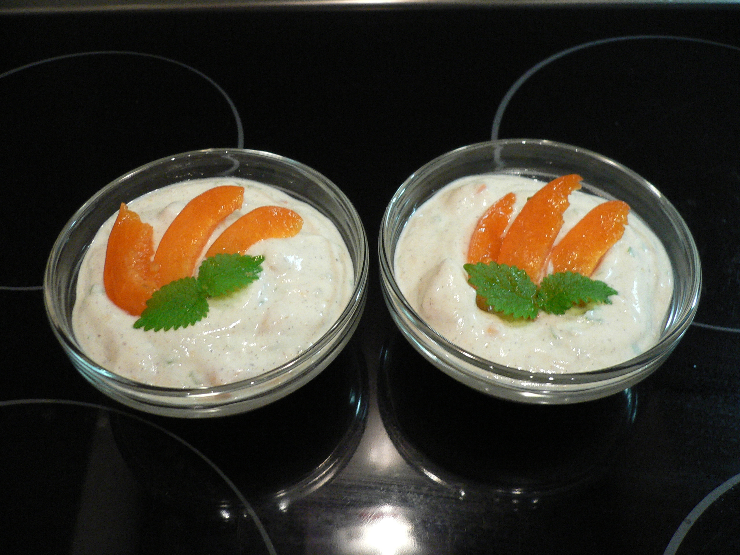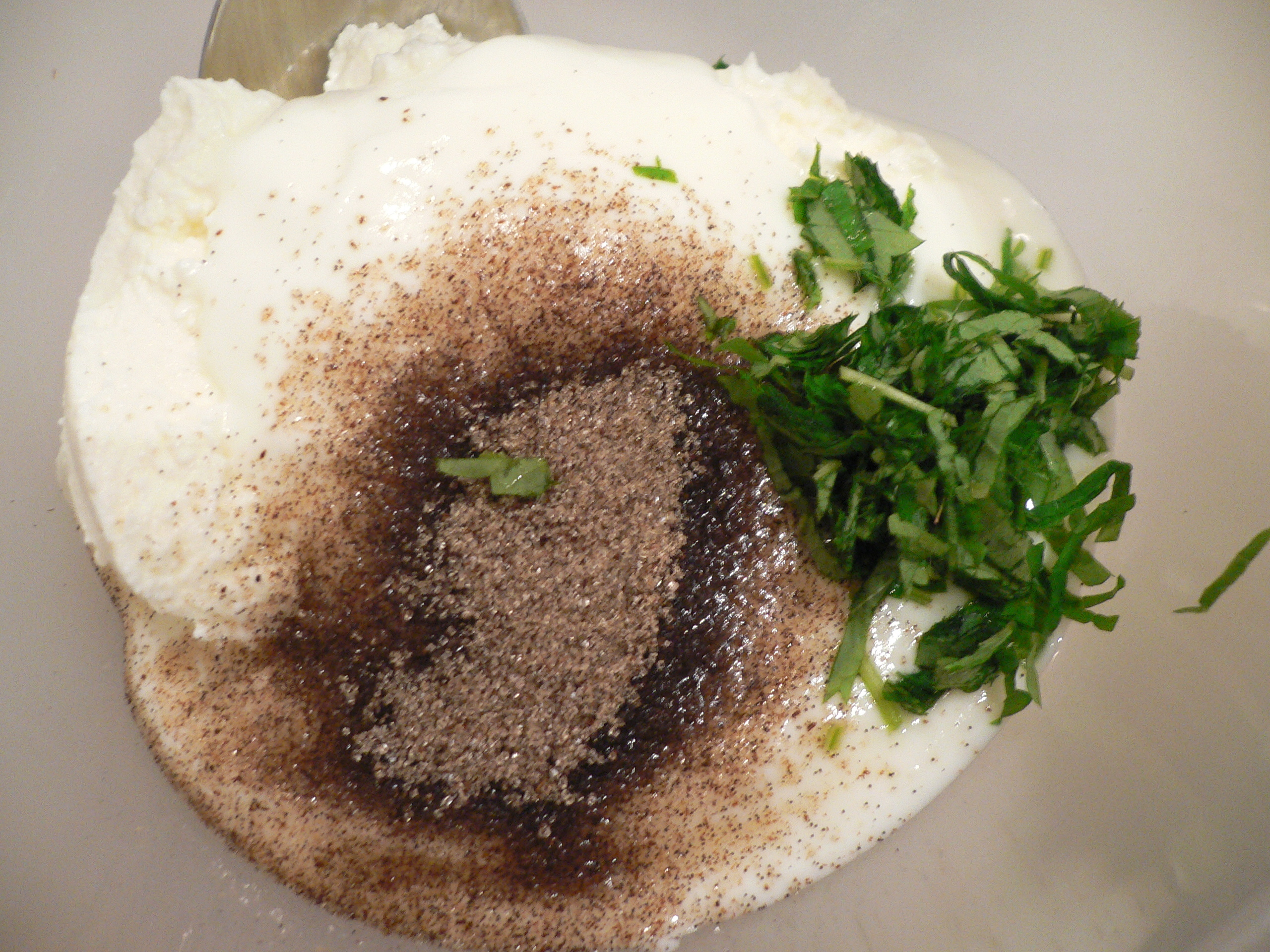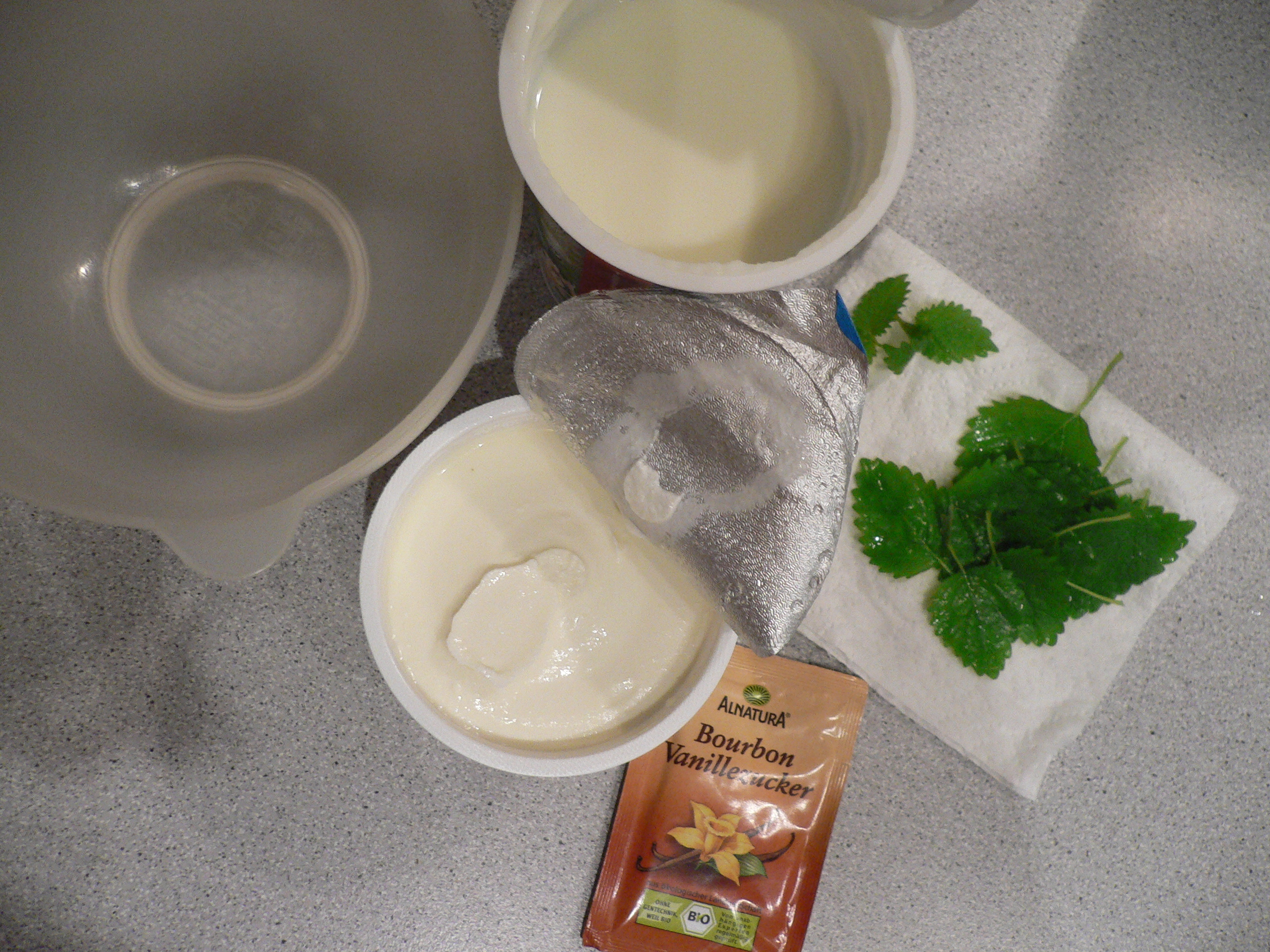 Here you can see the ingredients: curd, yogurt, vanilla, lemon balm (and apricot, which aren't in the picture because I decided later to add them)