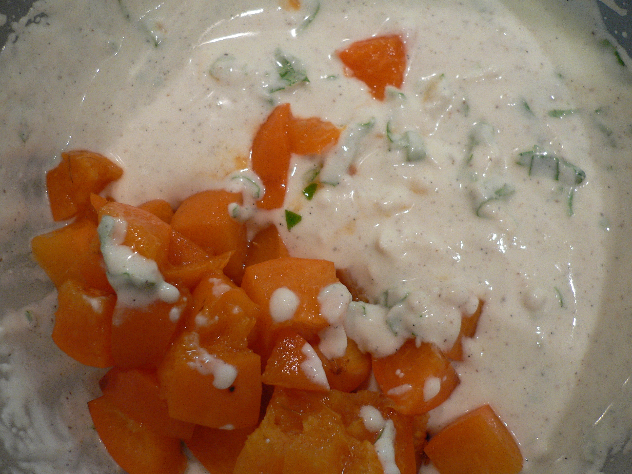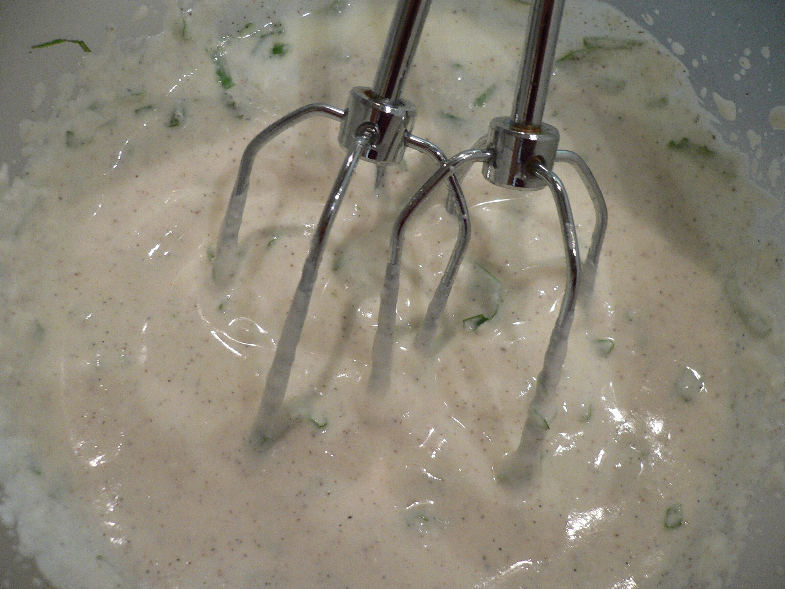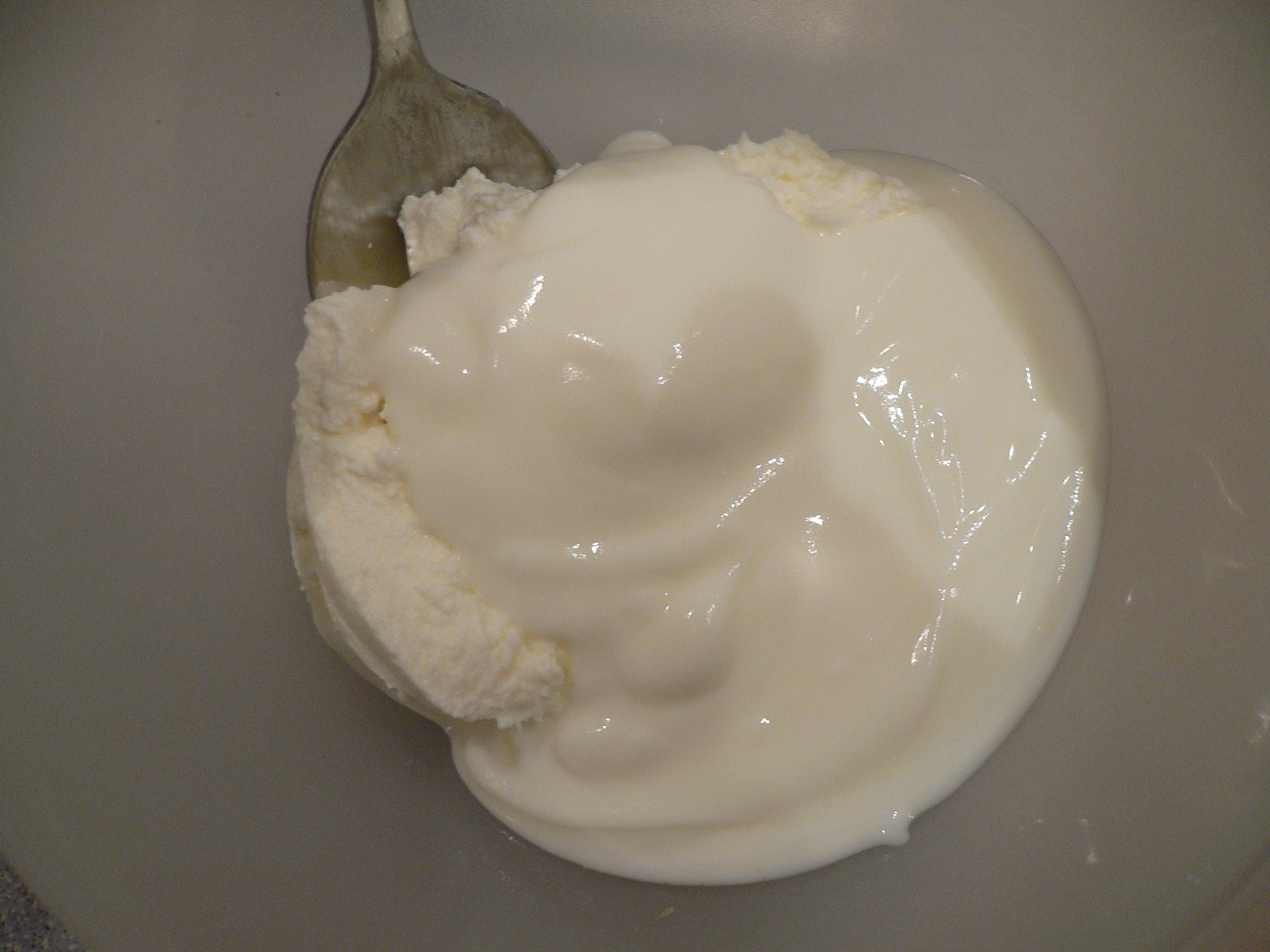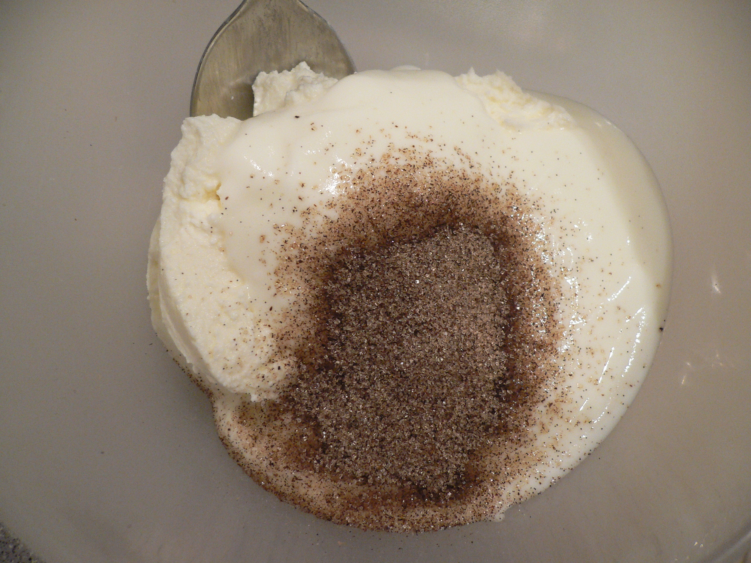 Here you can see the ingredients: curd, yogurt, vanilla, lemon balm (and apricot, which aren't in the picture because I decided later to add them)