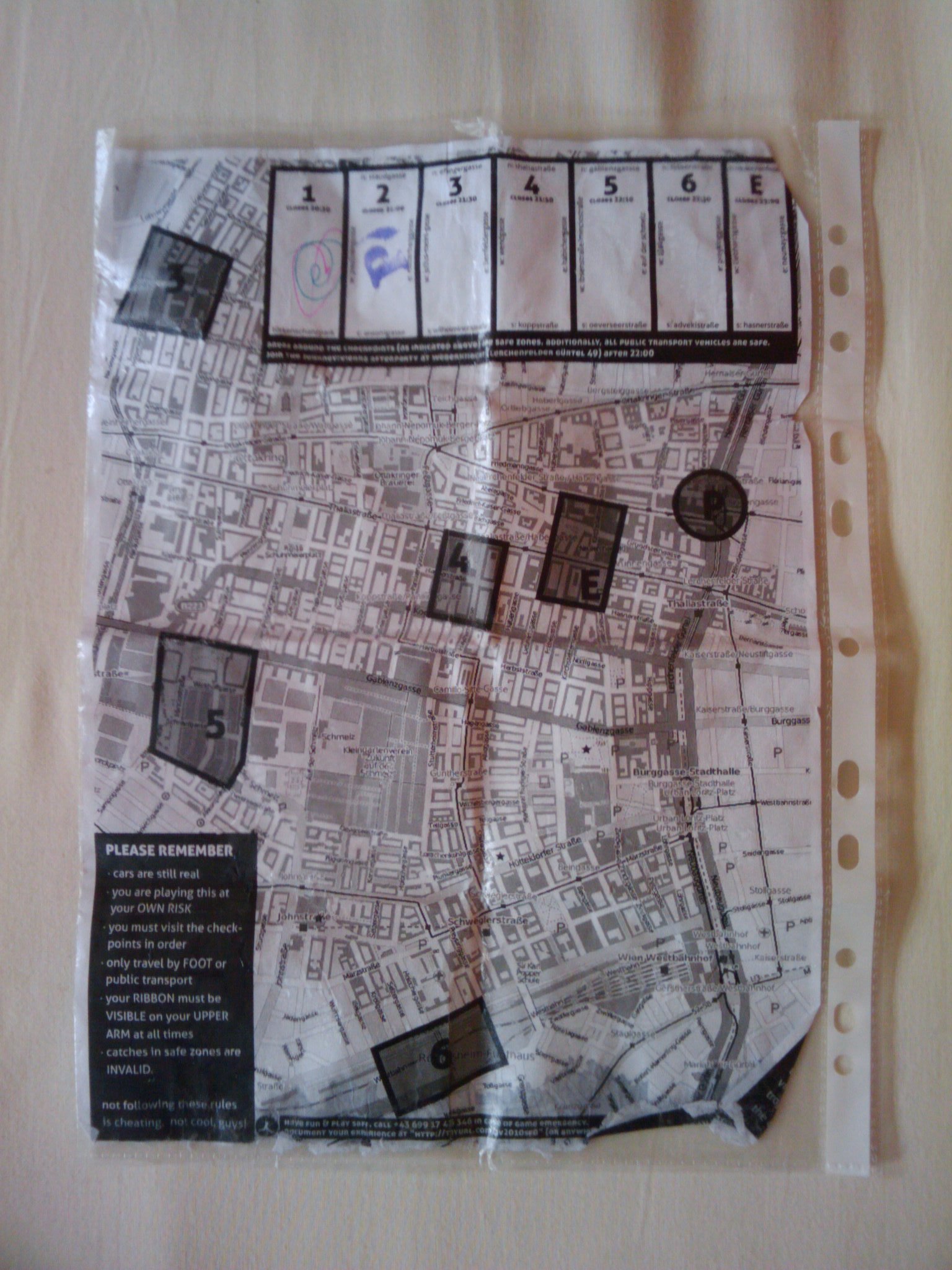It started raining about an hour before the start. Well, i thought i didn't care ... I went alone to the event and was running with nice twins. Checkpoint 1 was in the Tuerkenschanzpark. We were looking for the checkpoint about 20 minutes. Wasn't really that easy :D On the way to checkpoint 2 we met 2 chasers. But they were just getting into the tram. We reached checkpoint 2, wasn't easy neither and went on to find checkpoint 3. But we got tagged ... With a bunch of chasers we decided to skip checkpoint 3 and went on to checkpoint 4. We were all soaked to the skin and most of us went home. Motivation was totally gone ... As chaser i didn't catch a runner, but a cold ;)