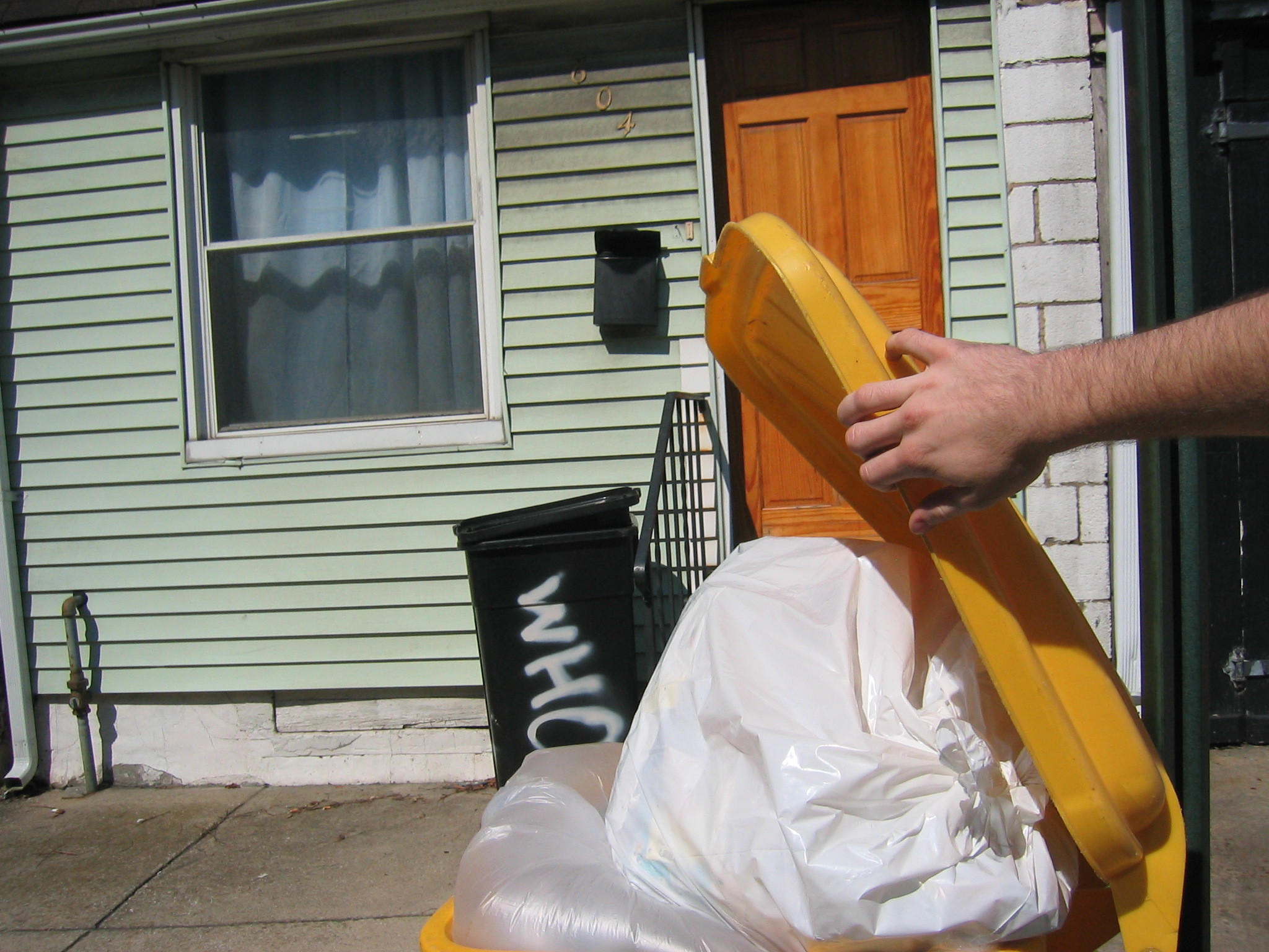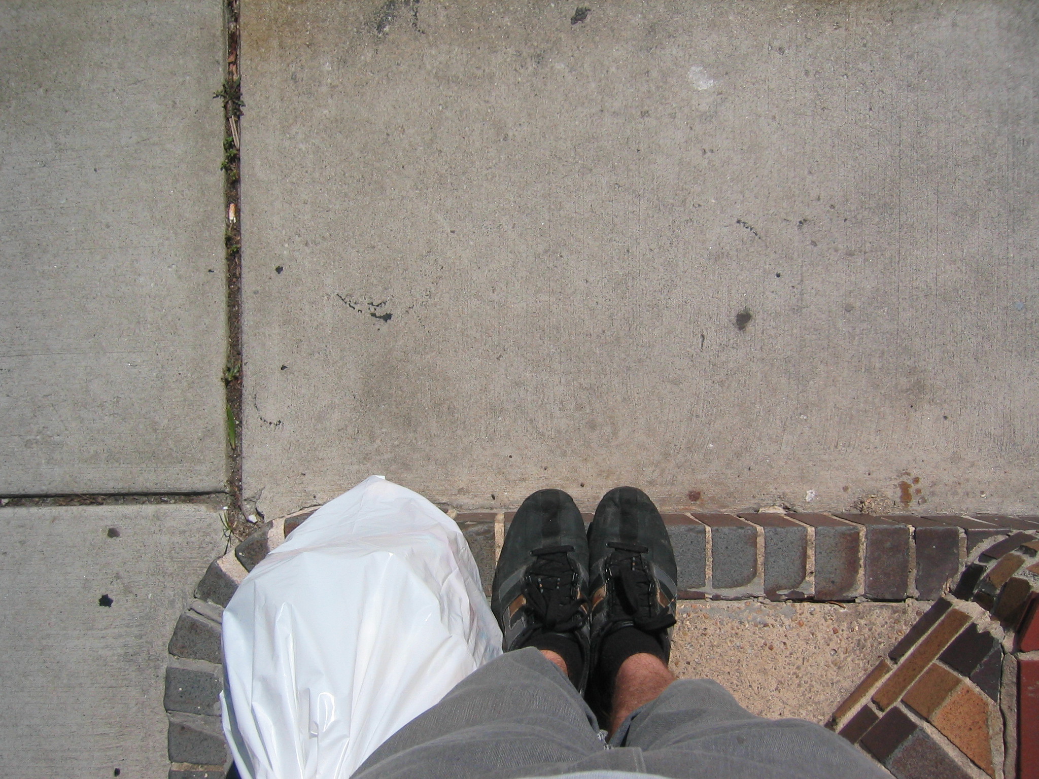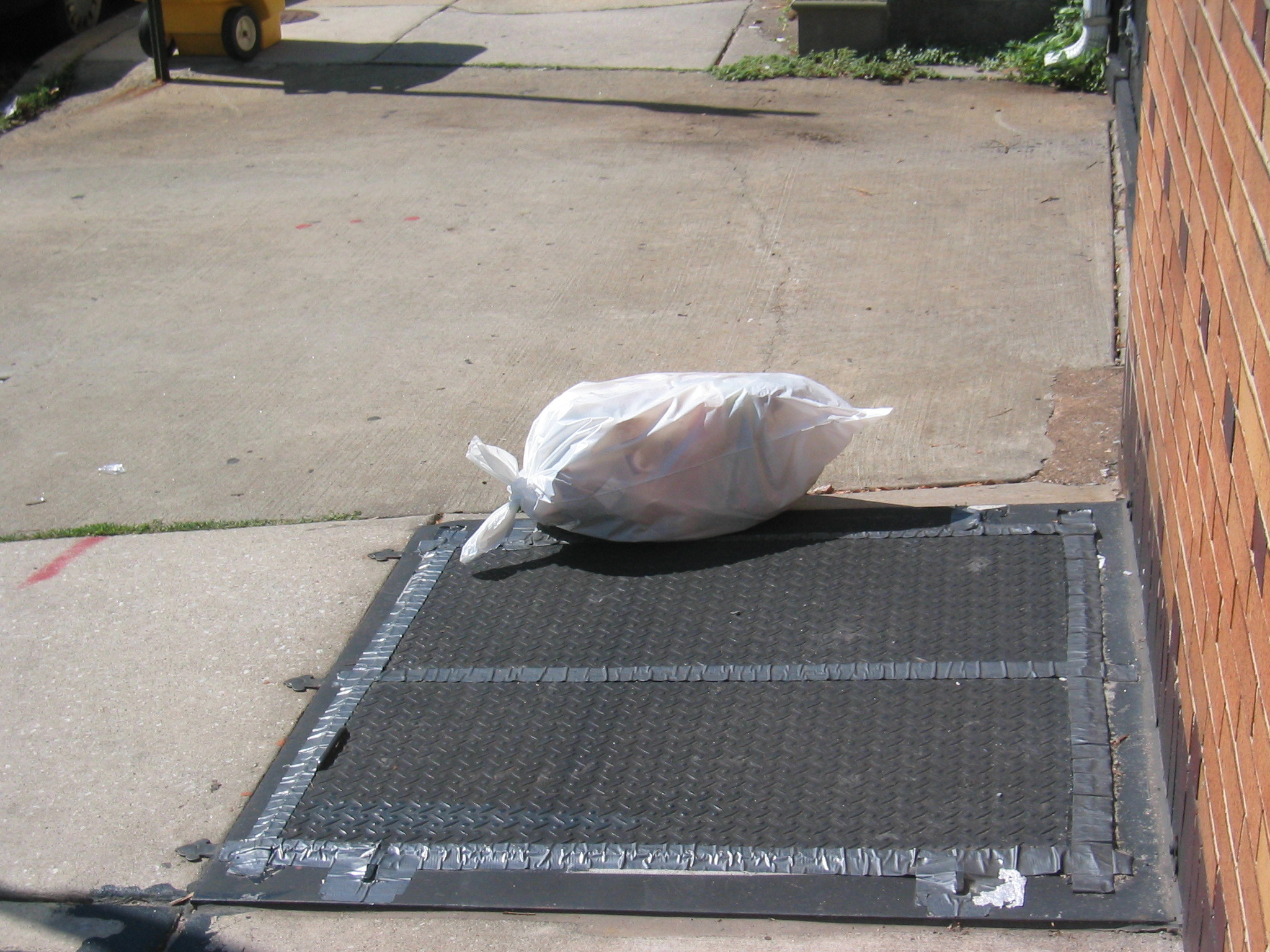 I figured the cellar door wasn't technically part of the sidewalk, so i tossed the trashbag over to the cellar door. (i felt the need to fully discriminate against the sidewalk and not even let my trash use it)