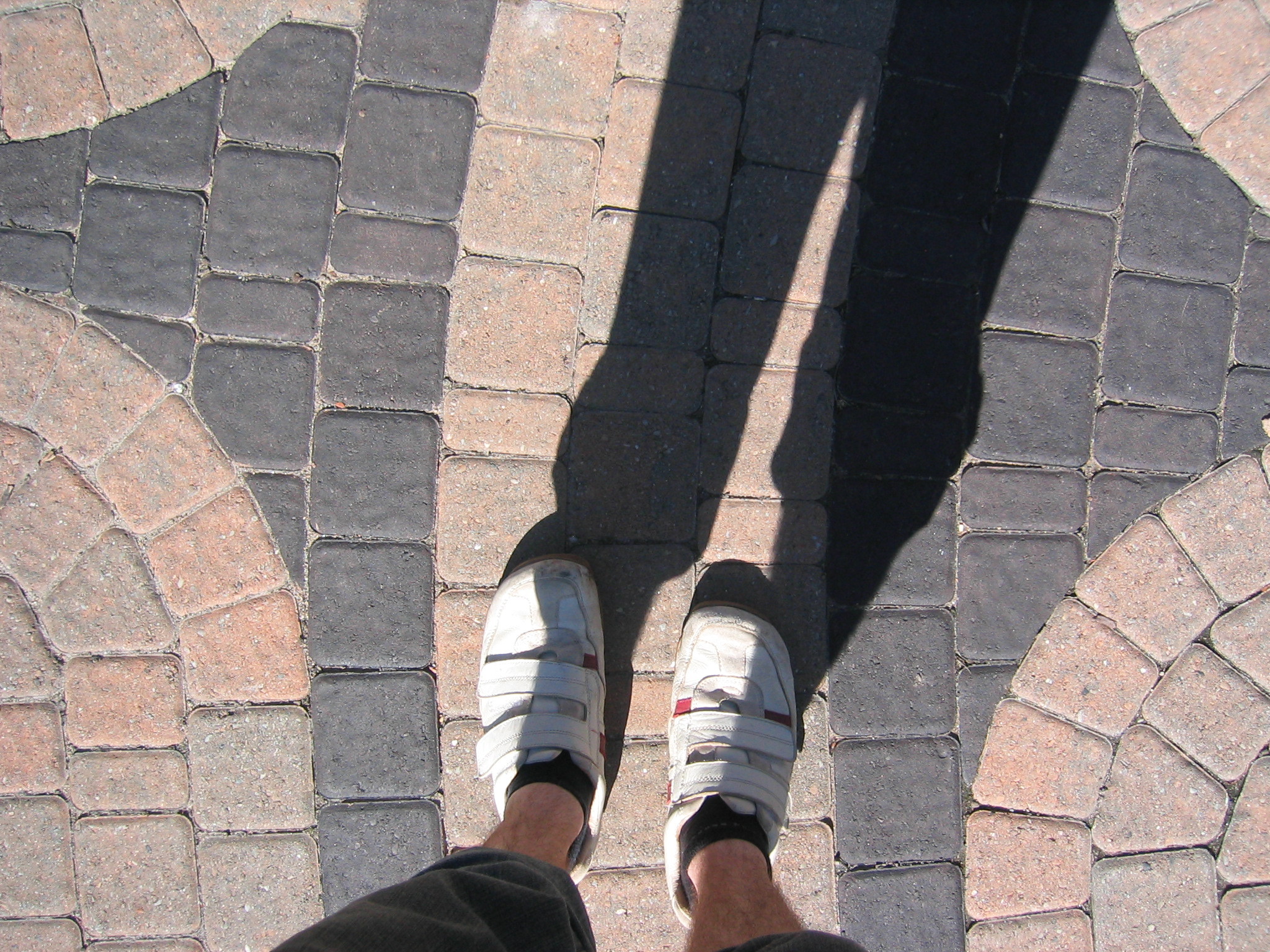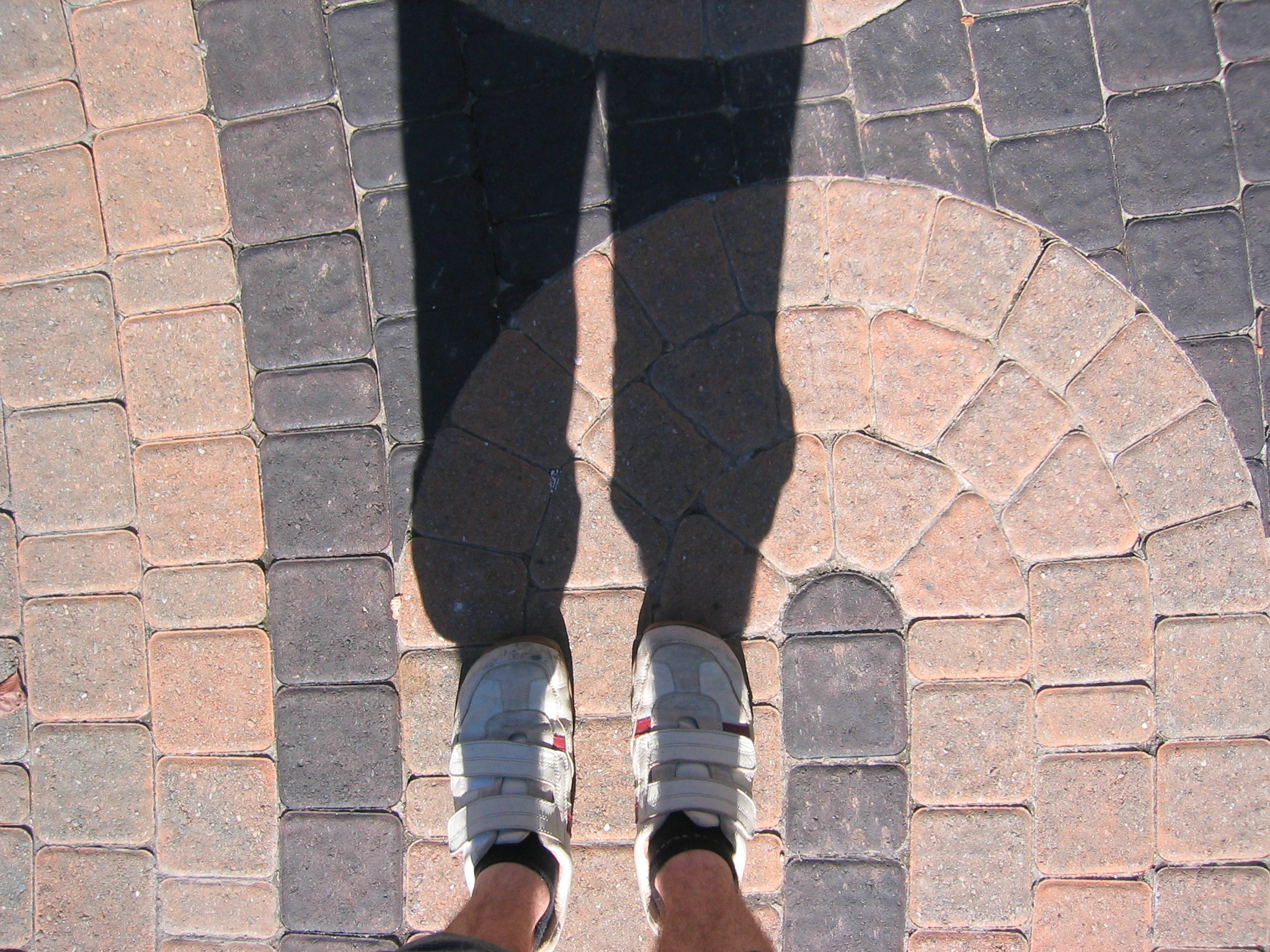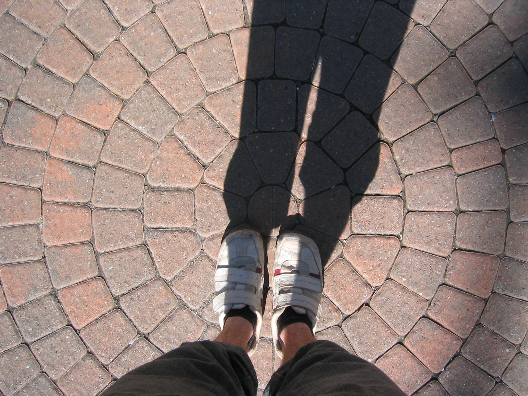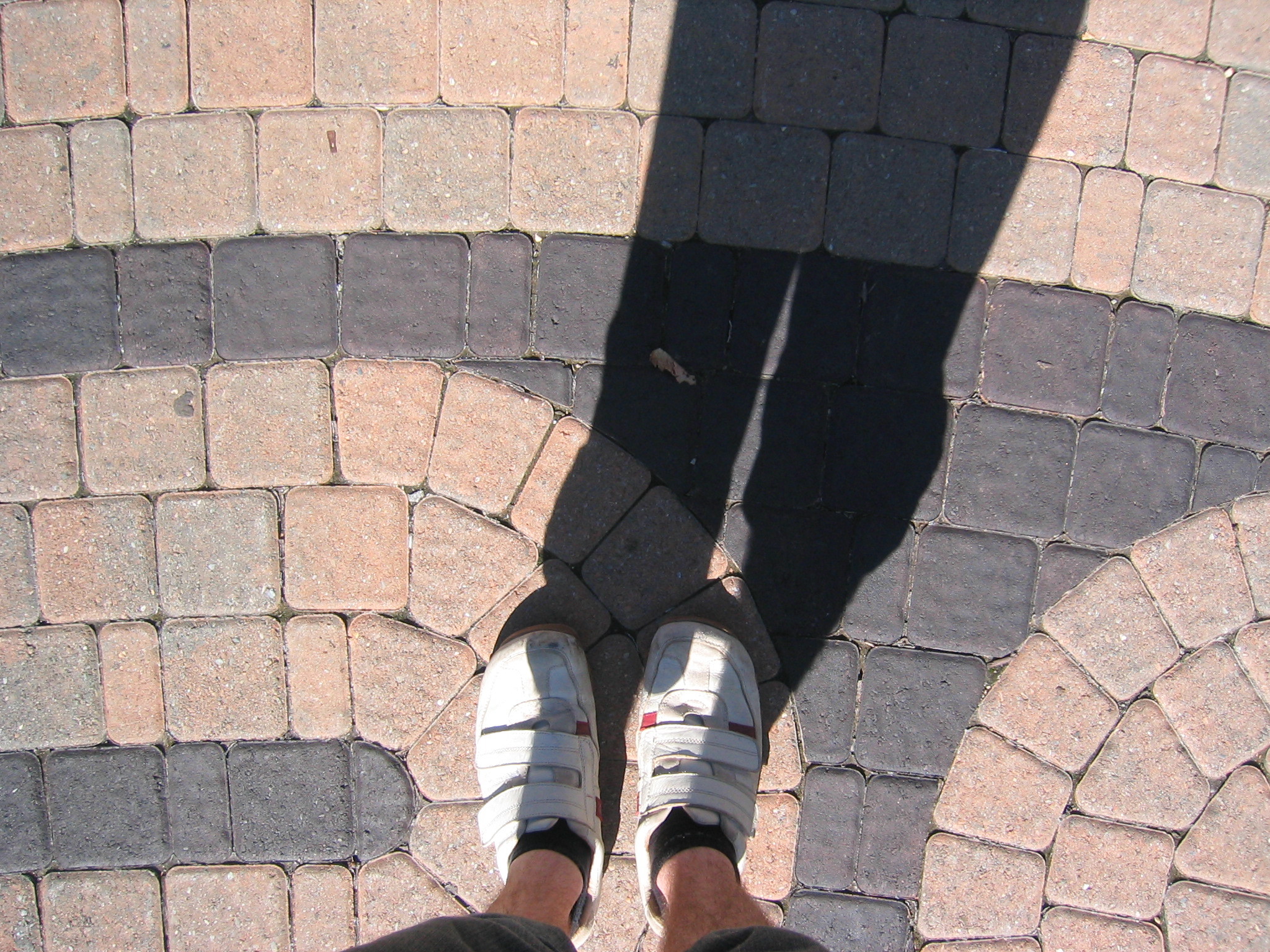 this labyrinth is located in the plaza of a church by the harbor. you can see the shadow of the cross directly in the middle of the labyrinth