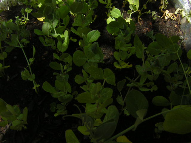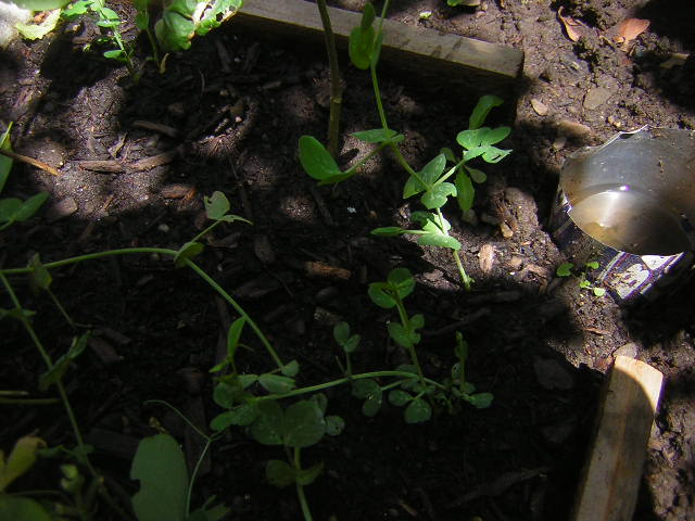 baby peas. these are only about two inches high. beer trap made from beer can for scale.
